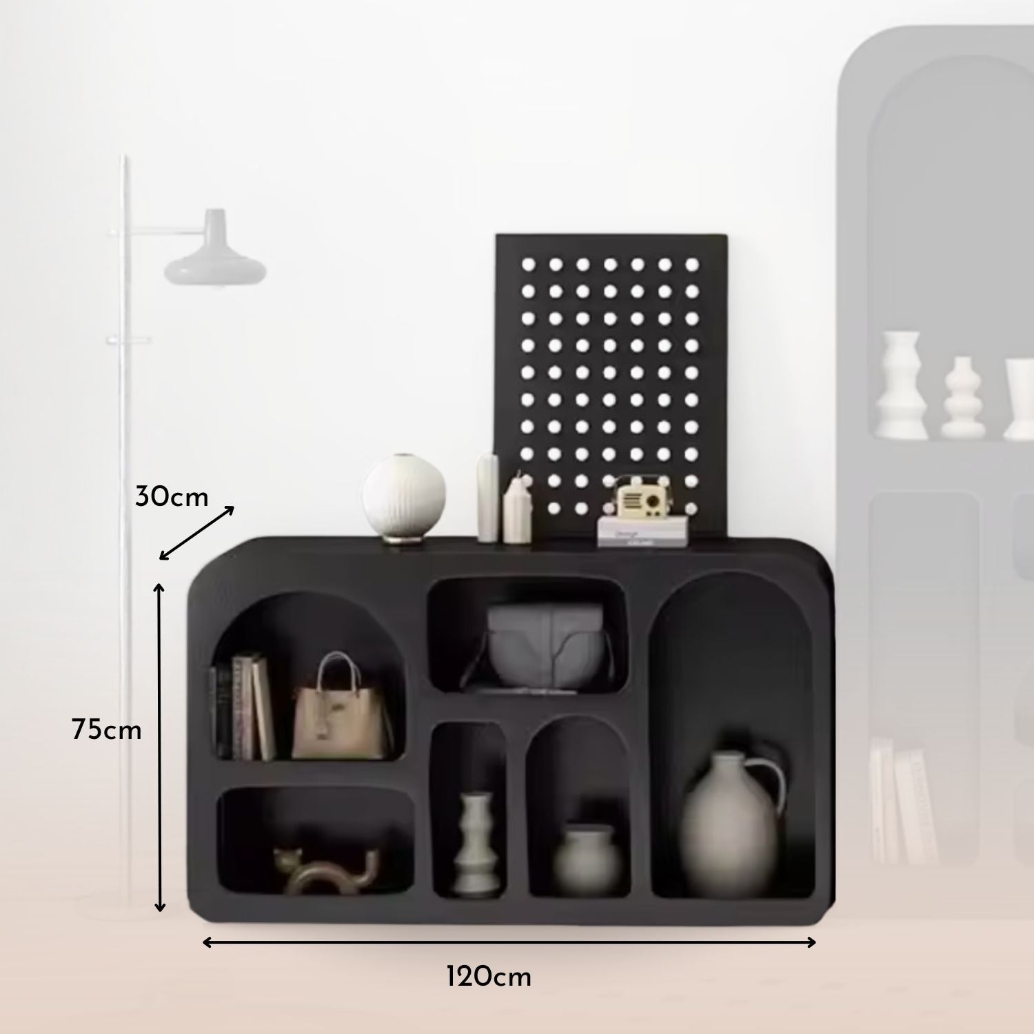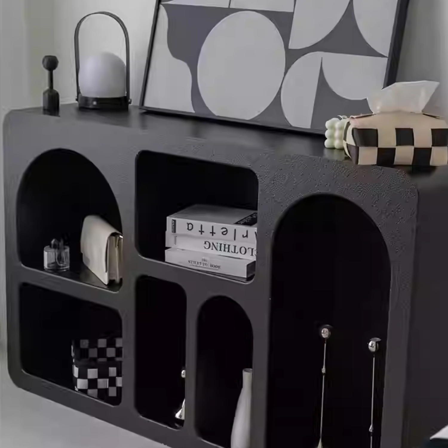 Pieza decorativa versátil, funciona tanto como mueble organizador como elemento visual destacado.