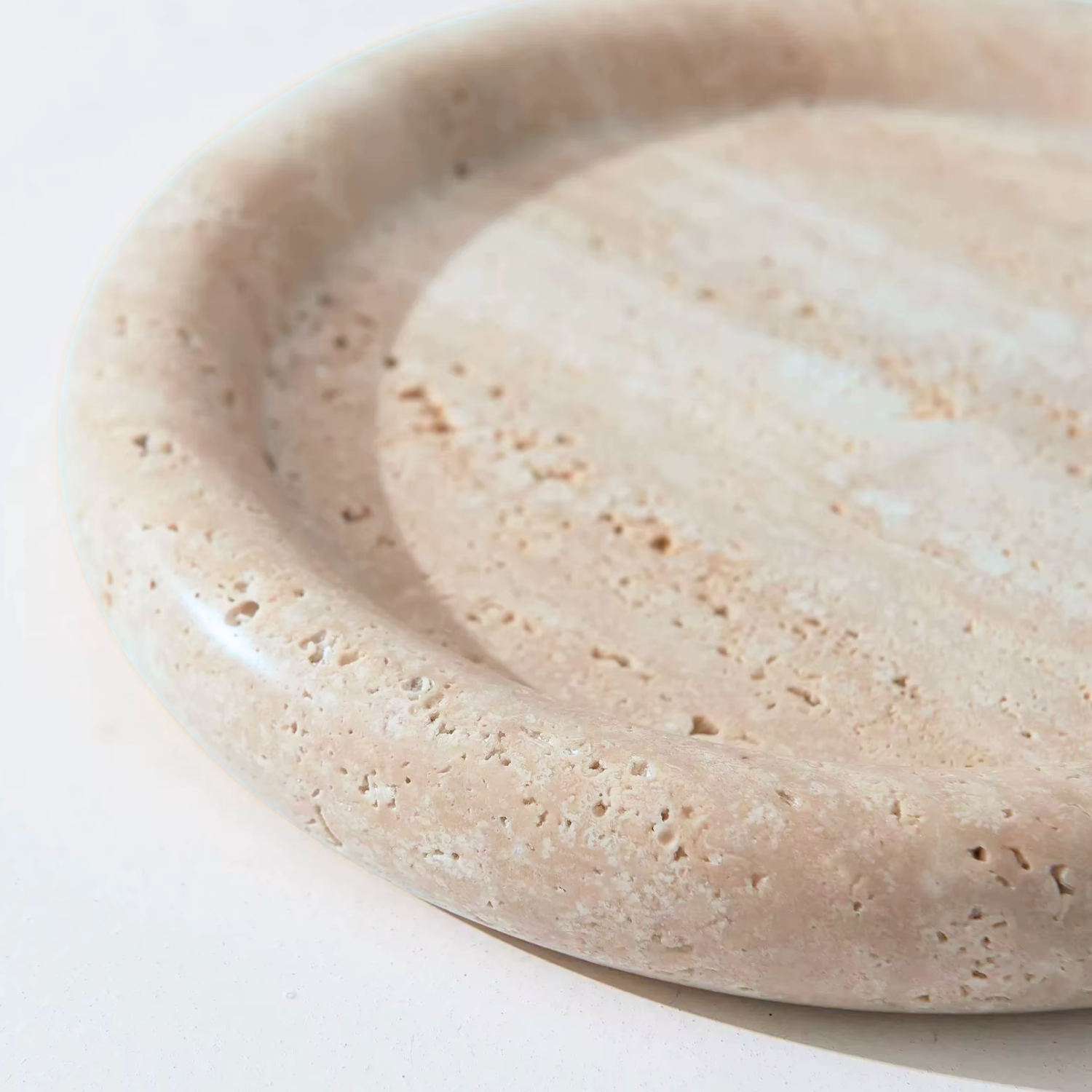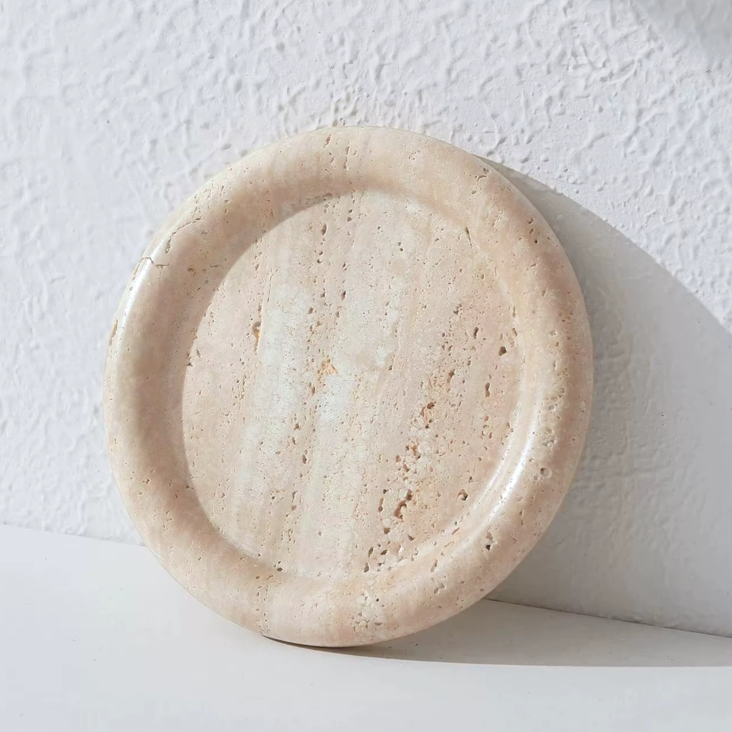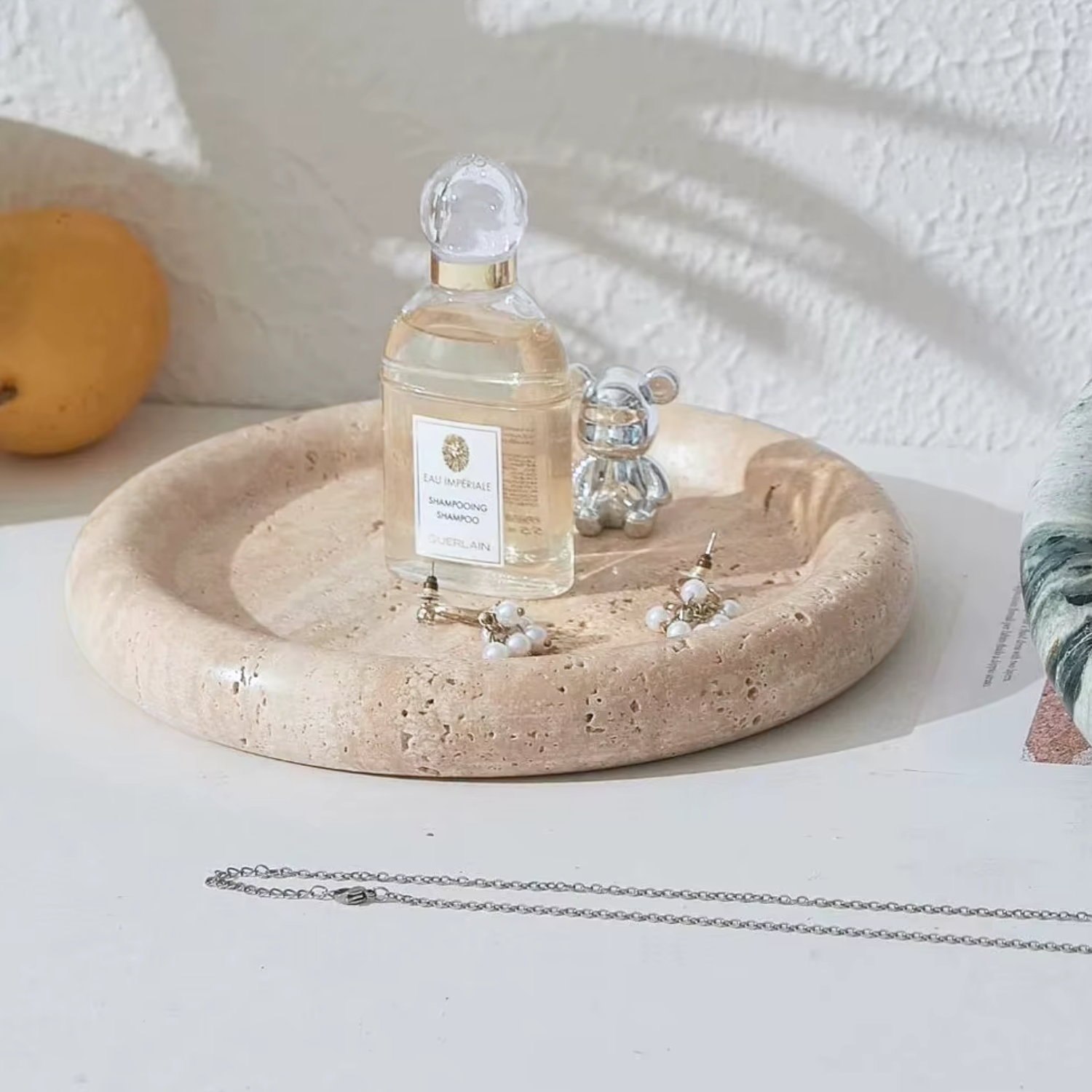 La Bandeja Redonda de Piedra Ámbar Travertino es una pieza decorativa elegante y funcional, perfecta para aportar calidez y estilo natural a cualquier rincón del hogar. Su diseño circular con bordes redondeados tipo anillo ofrece un contorno elevado que evita derrames, haciendo que tus objetos permanezcan siempre seguros y en su lugar.