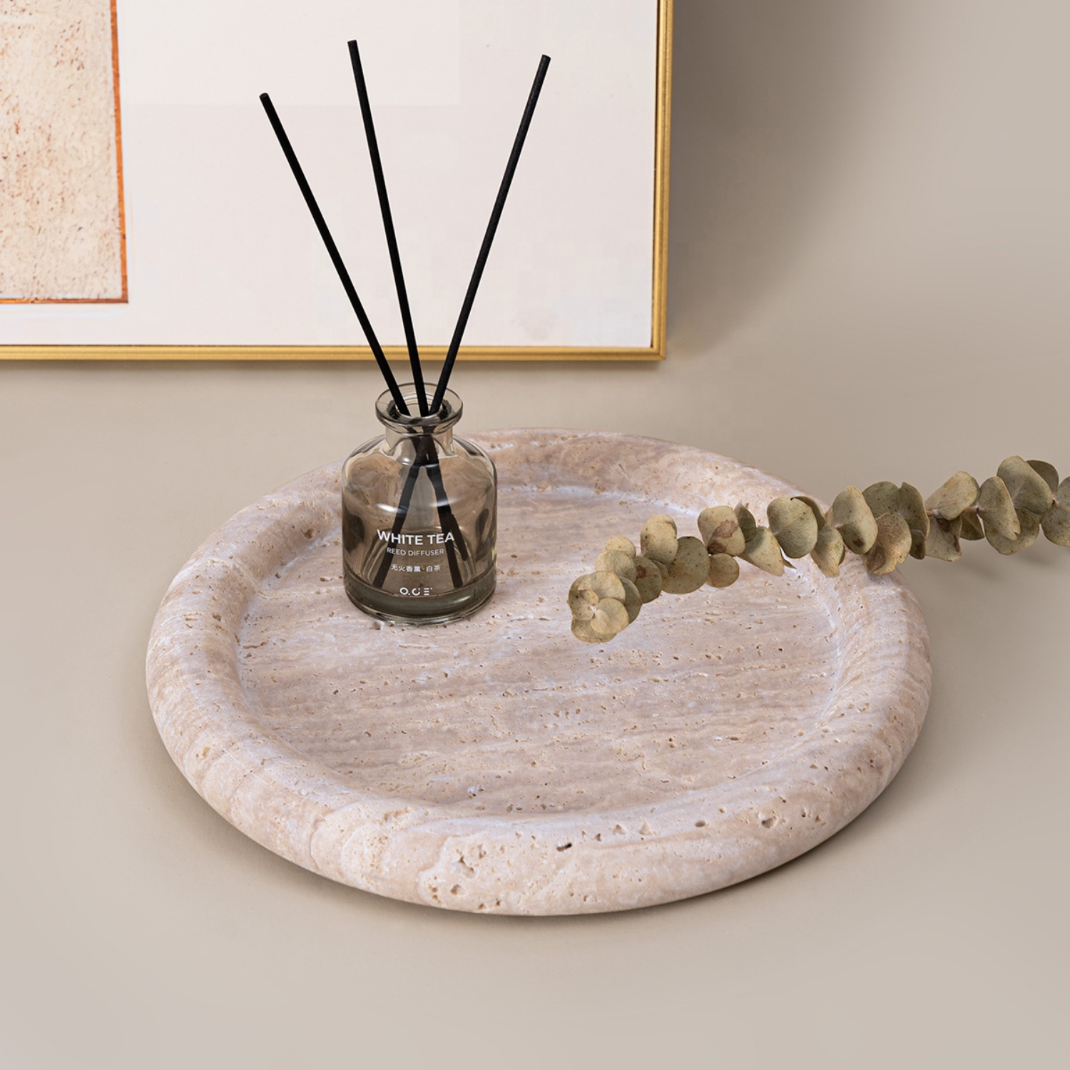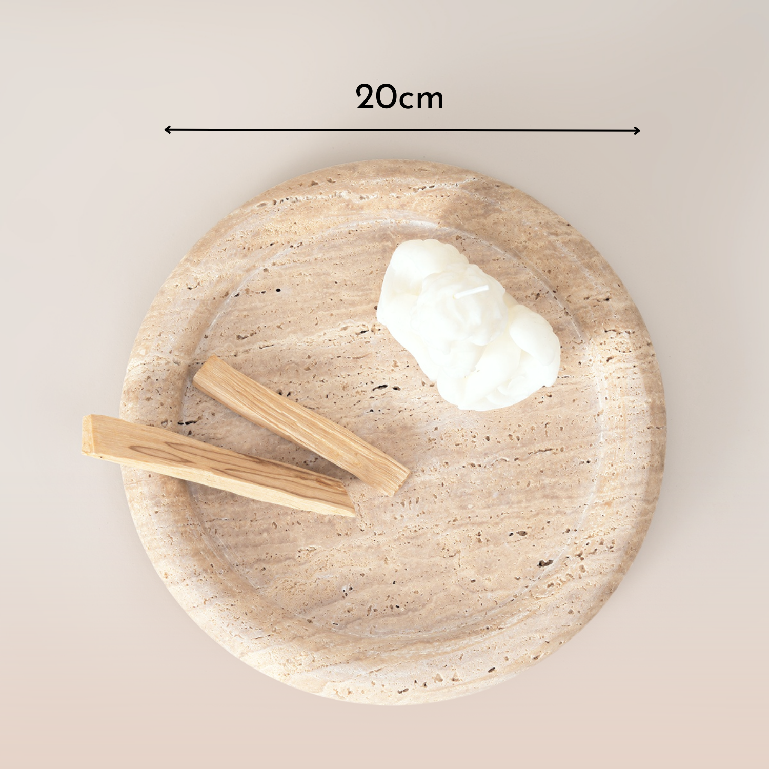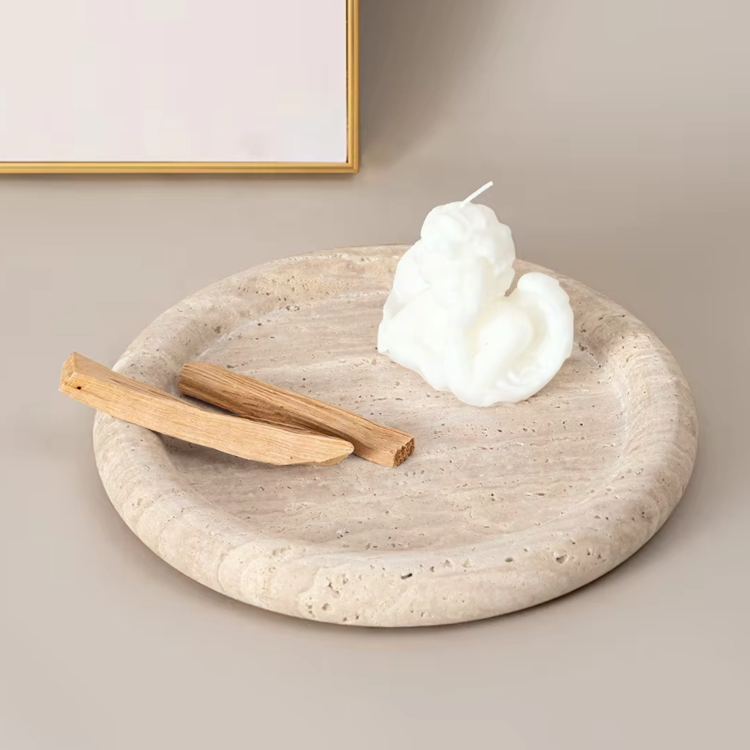 La Bandeja Redonda de Piedra Ámbar Travertino es una pieza decorativa elegante y funcional, perfecta para aportar calidez y estilo natural a cualquier rincón del hogar. Su diseño circular con bordes redondeados tipo anillo ofrece un contorno elevado que evita derrames, haciendo que tus objetos permanezcan siempre seguros y en su lugar.