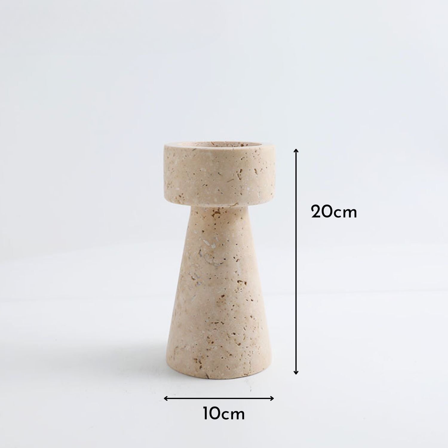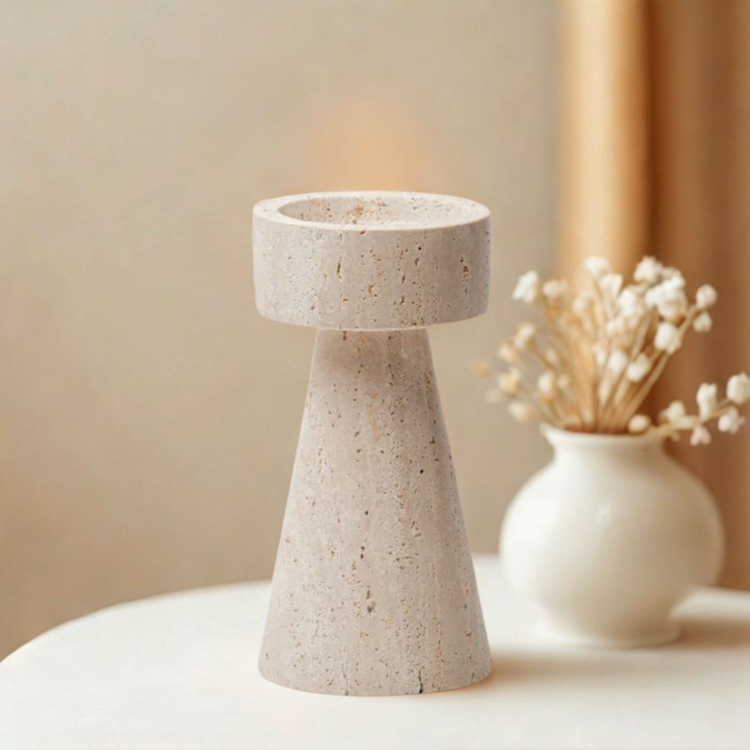 Elaborado en mármol travertino natural, cada candelabro es único, con vetas y texturas propias de la piedra, aportando un toque auténtico y elegante. Con una altura de 20 cm y base de 10 cm de diámetro, esta versión más pequeña es ideal para mesas auxiliares, repisas, baños o como parte de una composición decorativa junto a otras piezas. Su diseño atemporal encaja perfectamente en estilos modernos, rústicos, escandinavos o clásicos. También es un regalo refinado para quienes valoran la decoración con identidad y calidad artesanal.