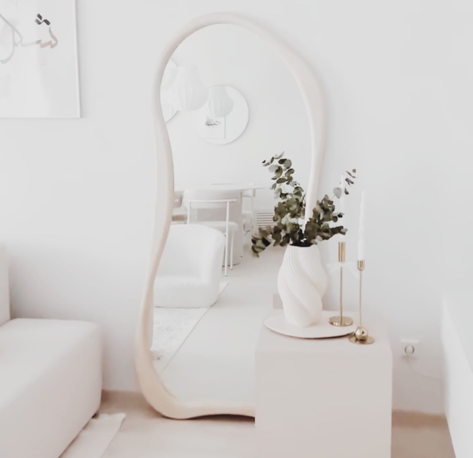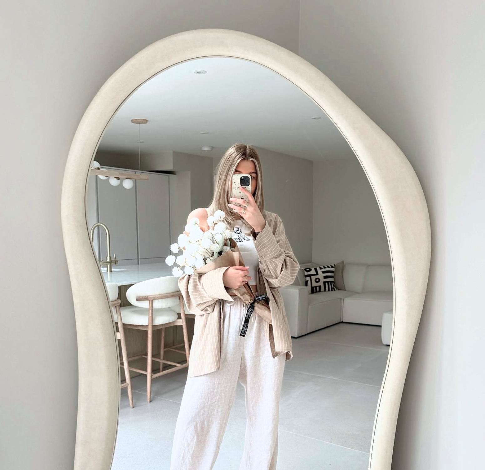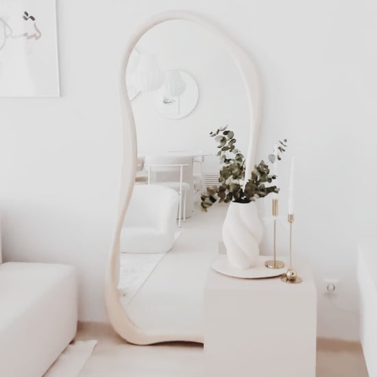 Nuestro Espejo Asimétrico de Cuerpo Entero en tono blanco es una pieza de diseño única que combina estilo noble con funcionalidad de alta calidad. Su marco de madera maciza con bordes irregulares y base curva le otorgan un carácter artístico y moderno, ideal para quienes buscan un toque distintivo en la decoración del hogar.