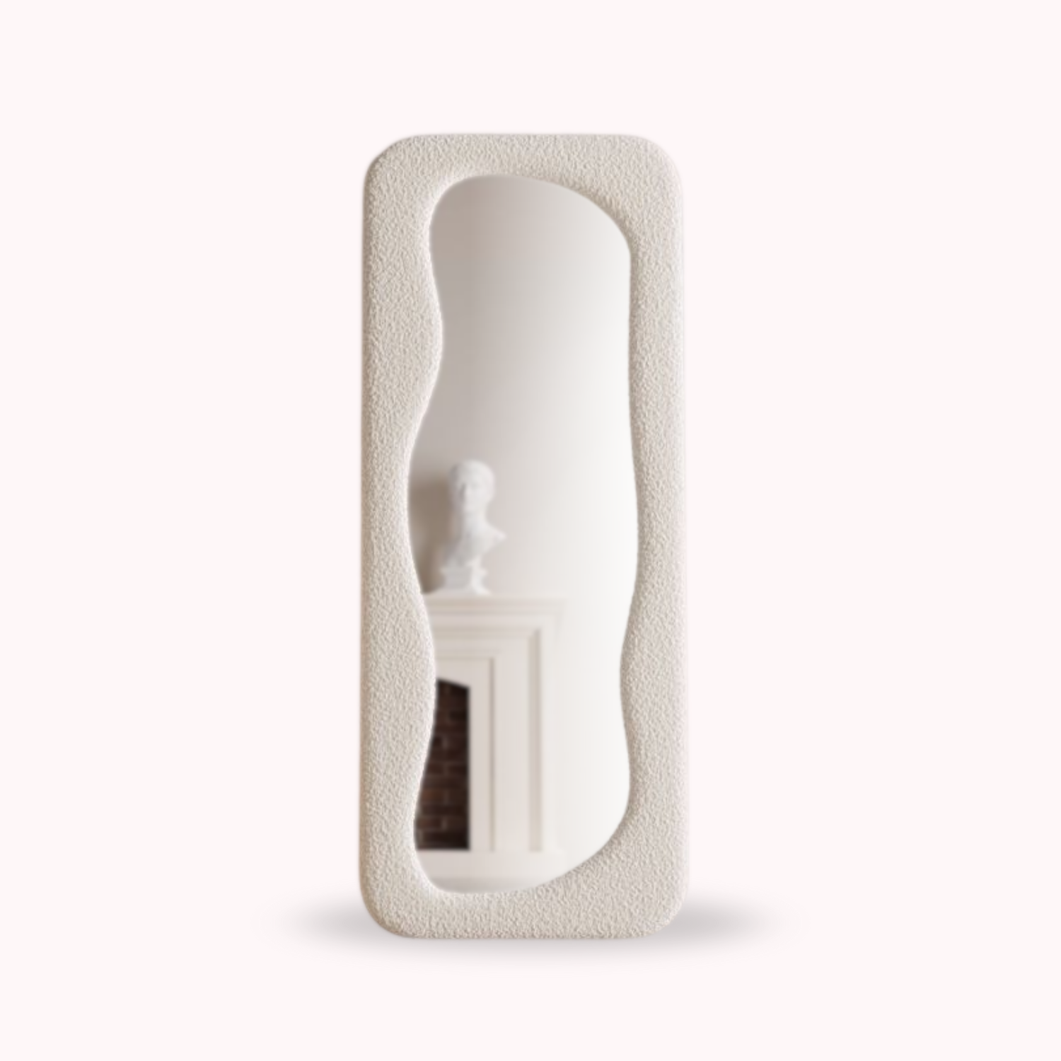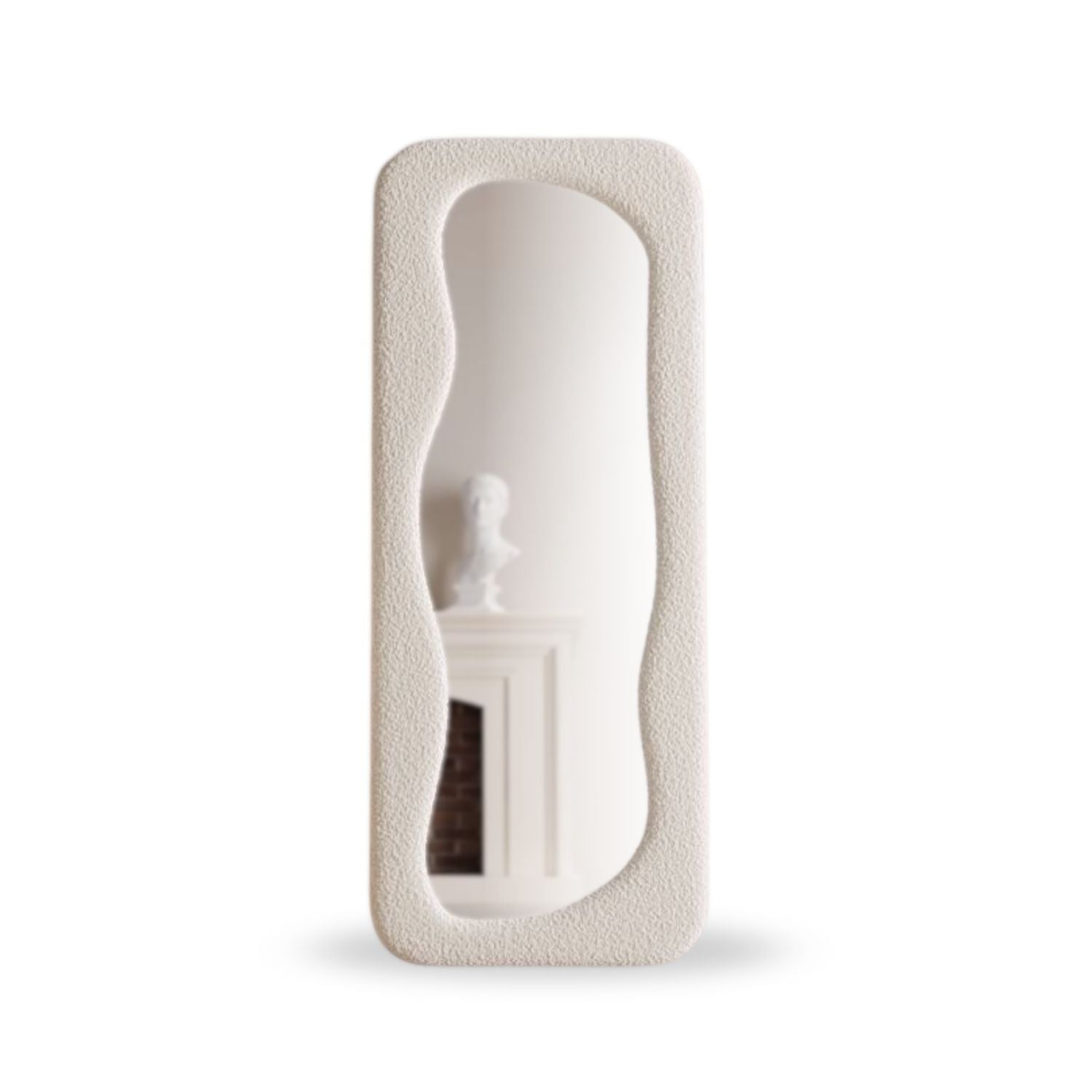 El marco del espejo presenta un diseño ondulado e irregular, que aporta dinamismo y originalidad al ambiente, en un elegante color blanco puro que combina fácilmente con cualquier paleta de colores o estilo decorativo. Fabricado con una base de madera sólida forrada en tela tipo bouclé, este espejo se distingue por su alta calidad y fabricación meticulosa, pensada para durar y destacar en cualquier entorno. Su instalación es versátil: puede colocarse apoyado sobre la pared para un estilo relajado o montarse en posición vertical fija para un acabado más estructurado y seguro.
