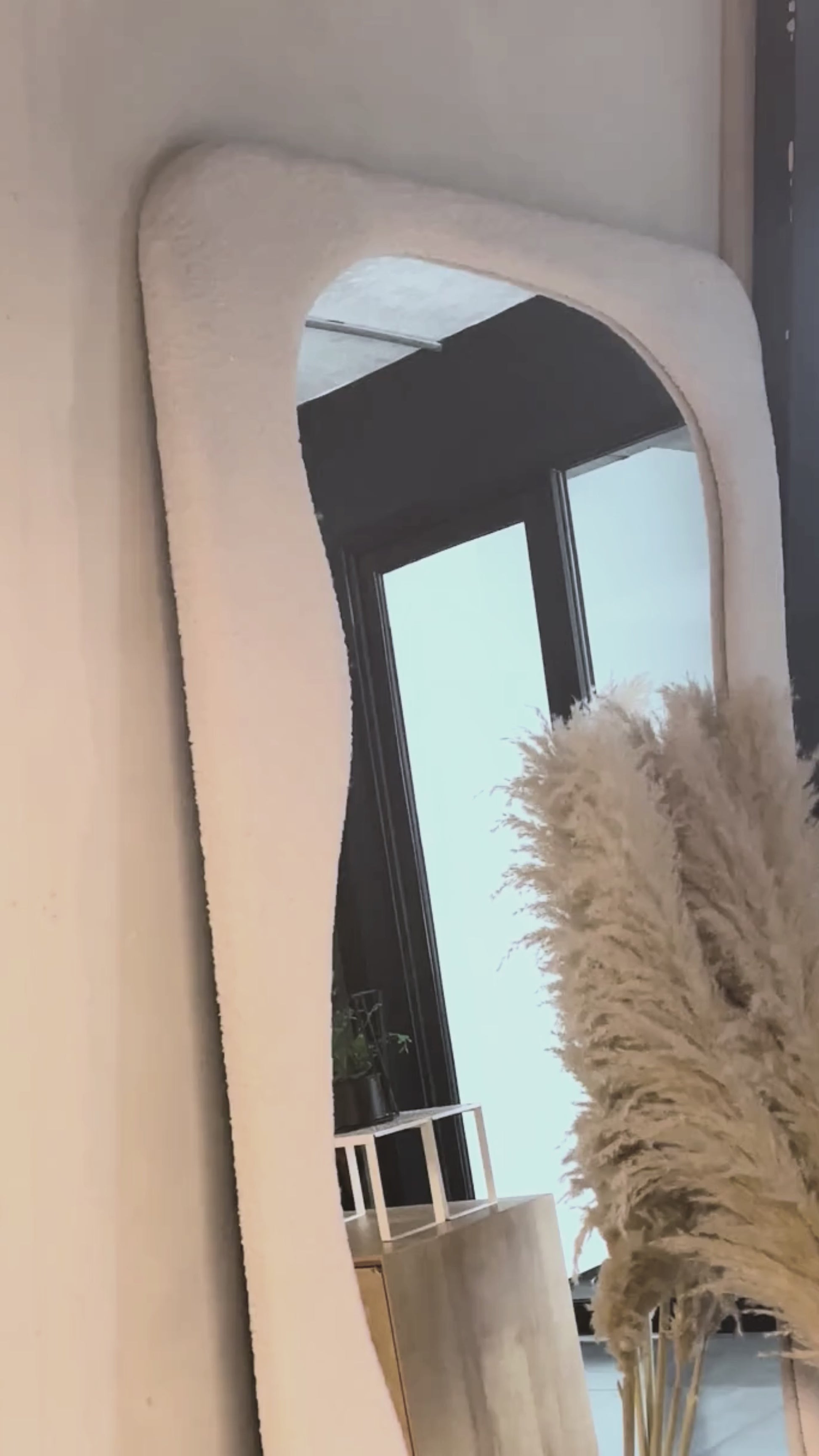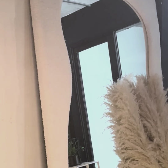 El marco del espejo presenta un diseño ondulado e irregular, que aporta dinamismo y originalidad al ambiente, en un elegante color blanco puro que combina fácilmente con cualquier paleta de colores o estilo decorativo. Fabricado con una base de madera sólida forrada en tela tipo bouclé, este espejo se distingue por su alta calidad y fabricación meticulosa, pensada para durar y destacar en cualquier entorno. Su instalación es versátil: puede colocarse apoyado sobre la pared para un estilo relajado o montarse en posición vertical fija para un acabado más estructurado y seguro.