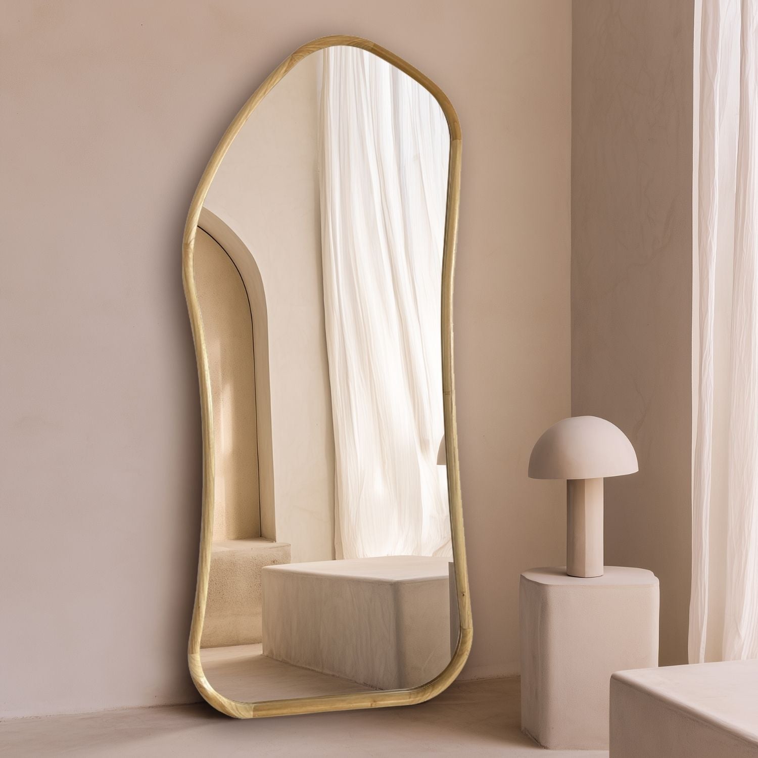 Agrega estilo y funcionalidad a tu hogar con nuestro espejo de figura irregular con borde curvo en madera maciza color claro.