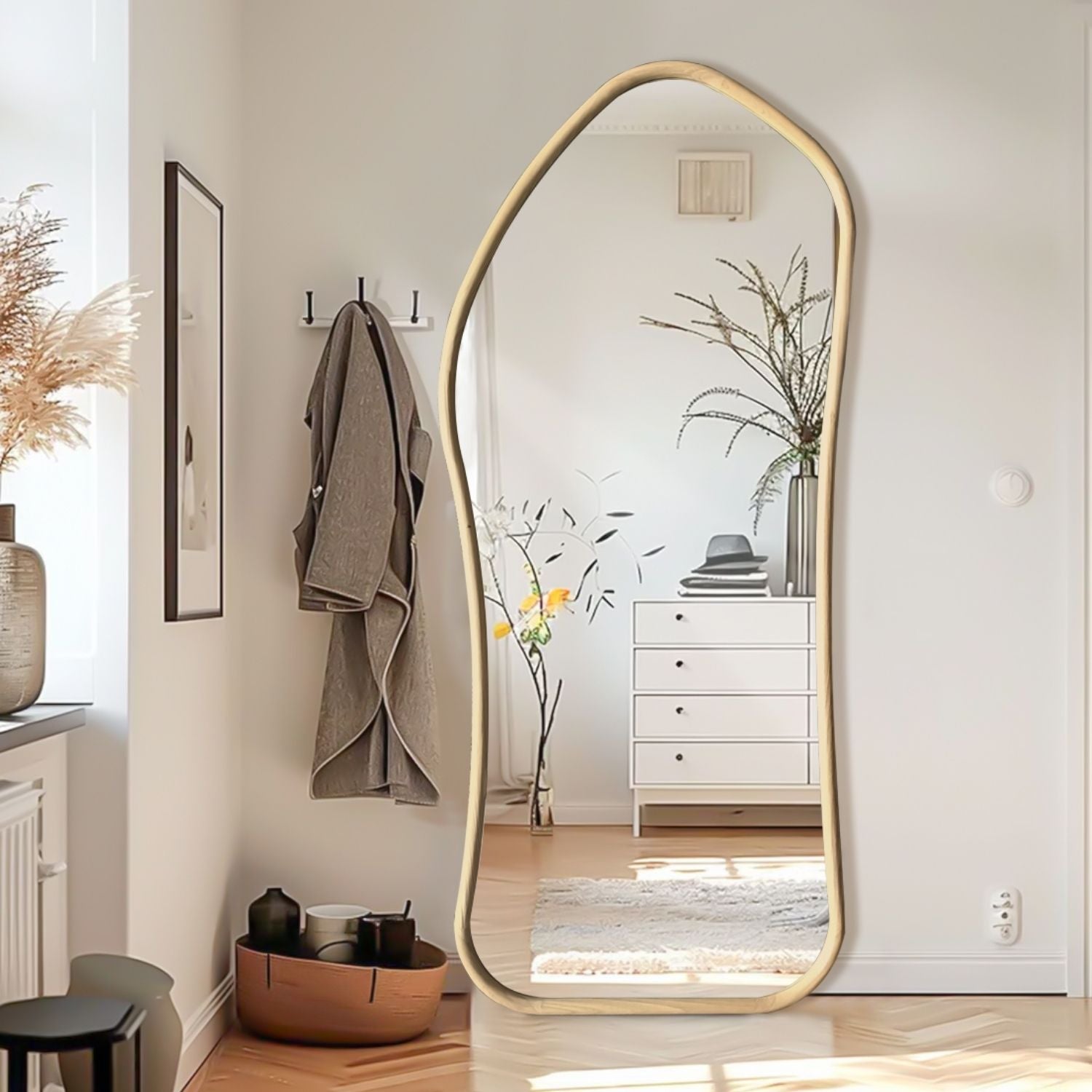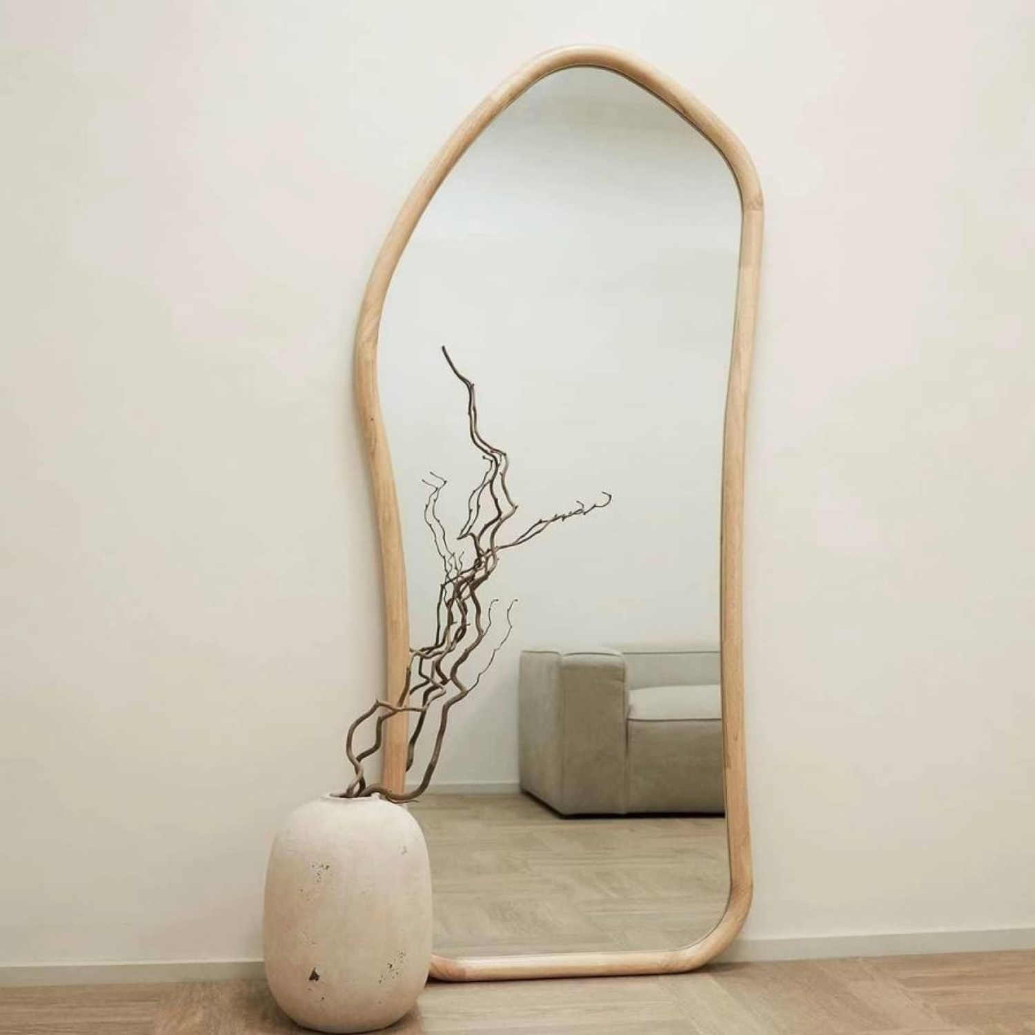 Espejo Irregular de Cuerpo Entero con Borde Curvo de Madera Clara – 200x100cm