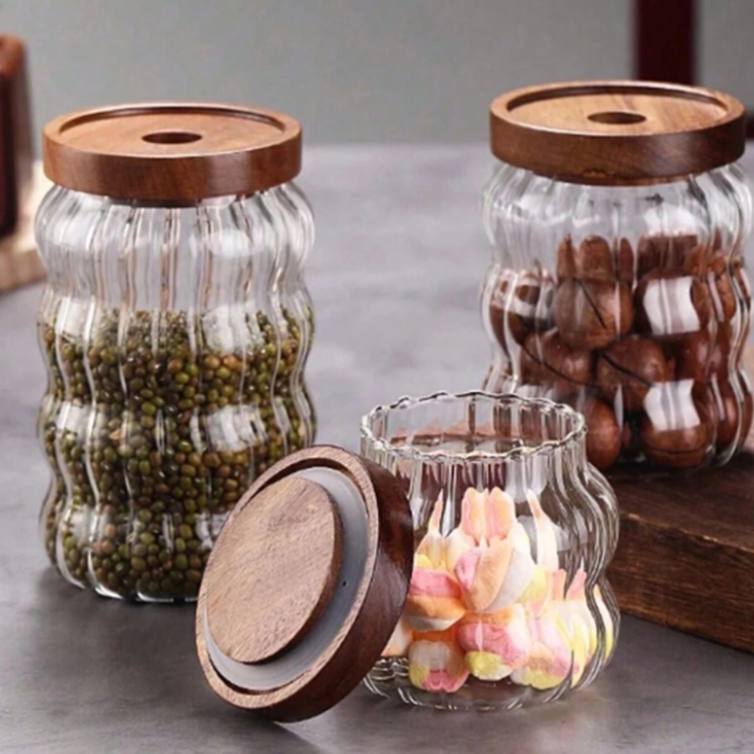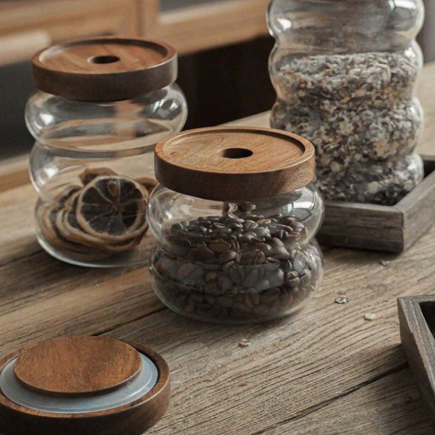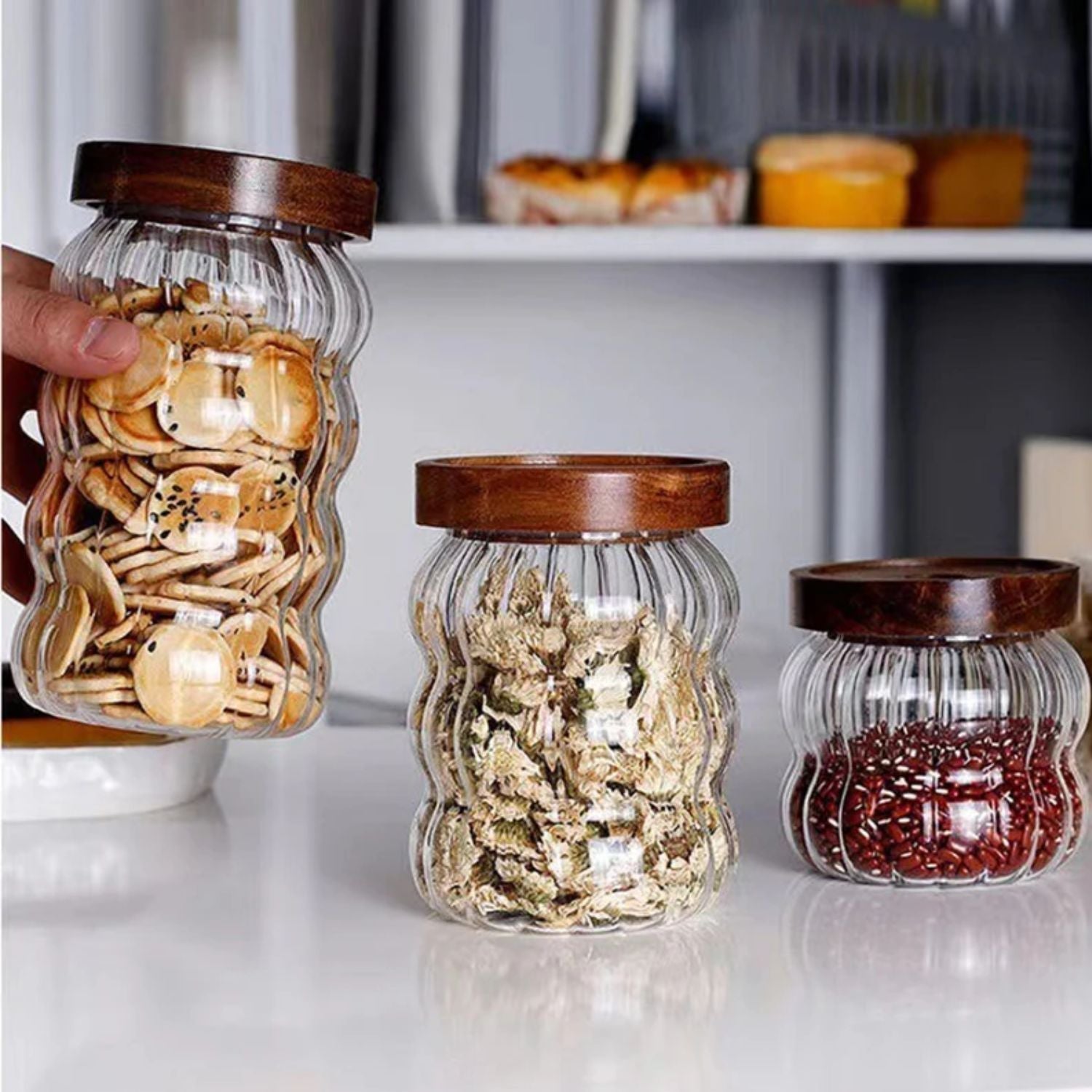 Frascos de Vidrio Tapa Madera y Ondas Set 3un