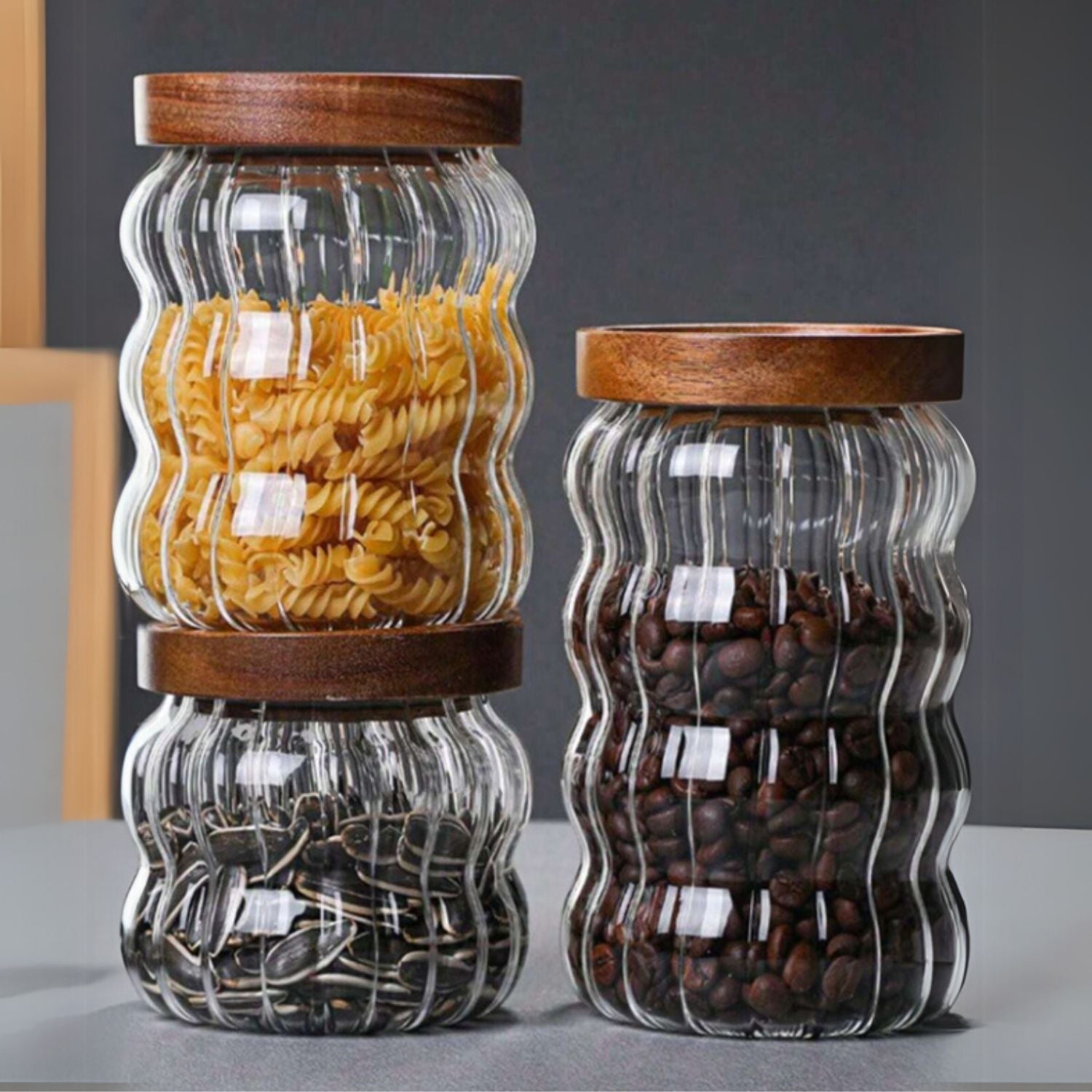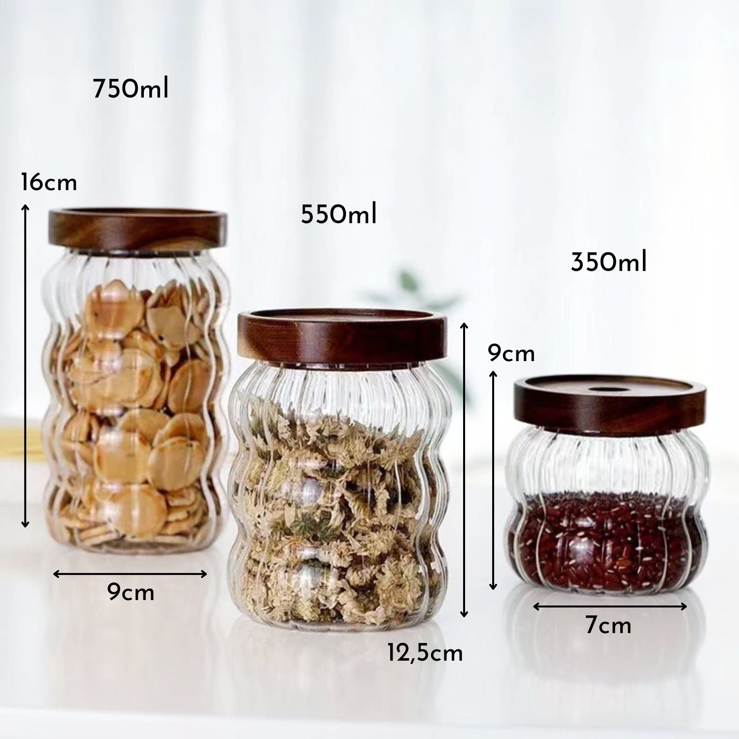 Organiza tu cocina con estilo y funcionalidad con este elegante set de frascos de vidrio. Cada set incluye tres frascos de diferentes capacidades: 750 ml, 550 ml y 350 ml, perfectos para almacenar condimentos, dulces, frutos secos, especias y mucho más. Fabricados en vidrio resistente de alta calidad, estos frascos cuentan con un atractivo diseño decorativo de rayas y ondas, que añade un toque moderno y sofisticado a cualquier espacio. Sus tapas de madera natural están equipadas con un anillo de goma de silicona hermética, garantizando una conservación óptima del contenido y evitando la entrada de aire y humedad.