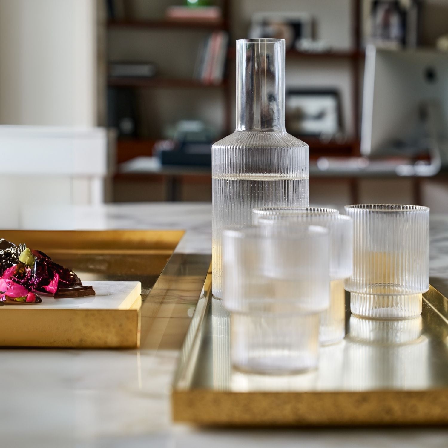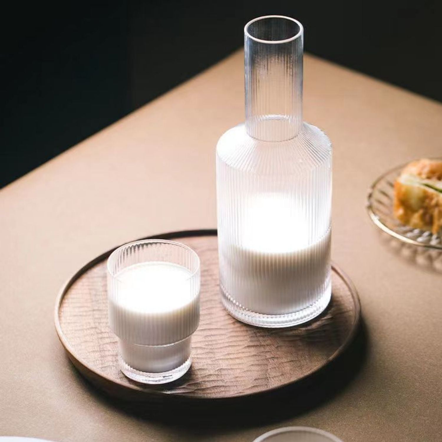 Sofisticación y estilo con nuestro exclusivo juego de vajilla que incluye una elegante jarra de 800 ml y cuatro vasos de 200 ml. Este conjunto presenta un encantador diseño de líneas verticales en relieve que, combinado con su acabado transparente, aporta un toque de modernidad a cualquier mesa. Ideal tanto para bebidas frías como calientes, perfecta para ocasiones especiales o el uso diario. Su borde redondeado le da un acabado lujoso, convirtiéndola en una pieza central que impresionará a tus invitados y realzará tu decoración. Fabricado con materiales de alta calidad, es resistente y duradero, asegurando que puedas disfrutar de su belleza por mucho tiempo. Sigue las últimas tendencias en decoración del hogar, equipando tu hogar con este juego de Vajilla.