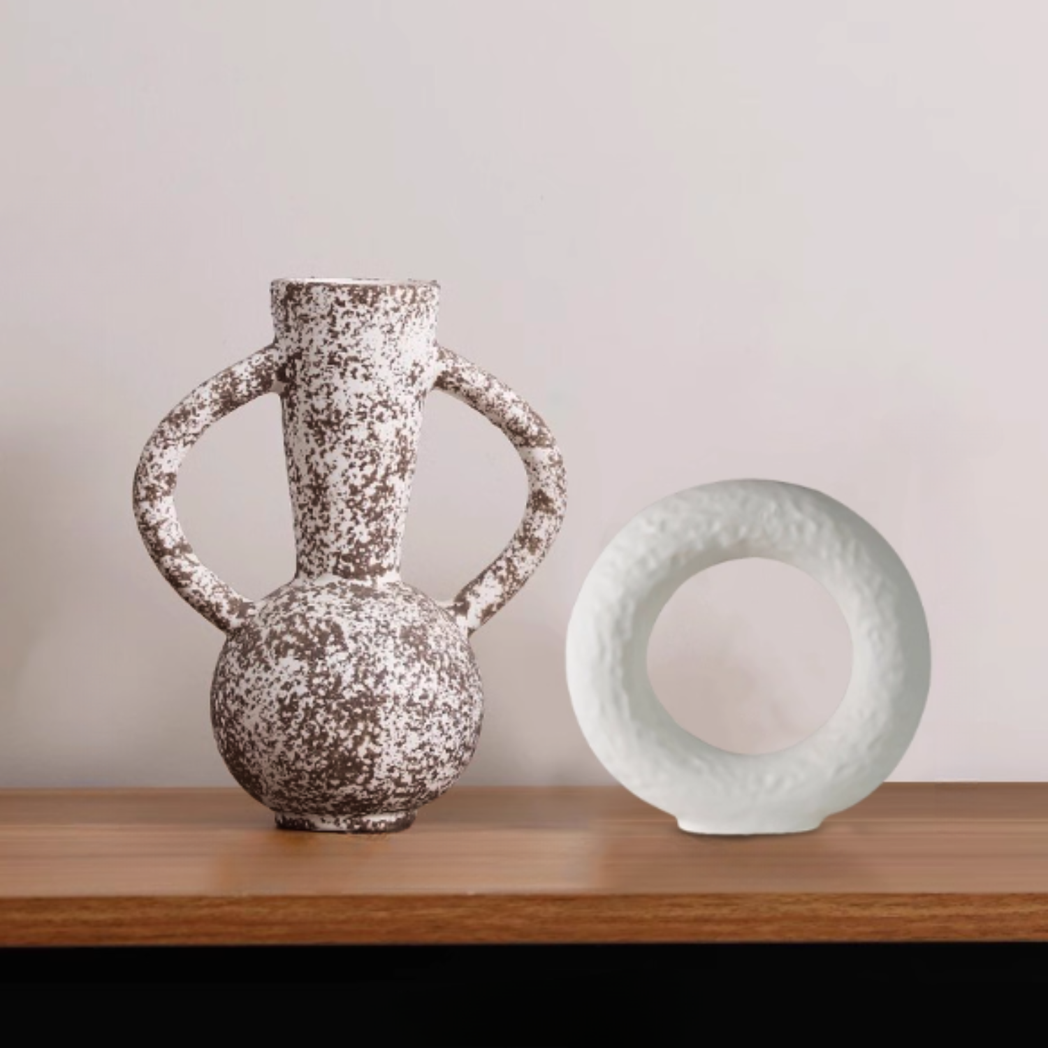 Set de 2 figuras decorativas (jarrón + escultura circular)