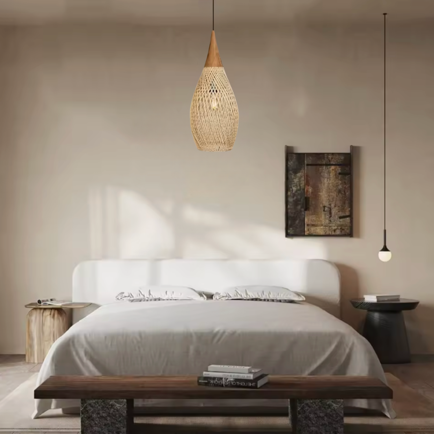 La Lámpara Colgante de Ratán Claro Gota de 25 cm es una pieza única de iluminación decorativa que fusiona lo artesanal con lo contemporáneo. Su pantalla tejida a mano en fibras naturales y base de madera crea un diseño cálido y atemporal, ideal para ambientes de estilo boho, wabi-sabi y decoraciones de inspiración natural.