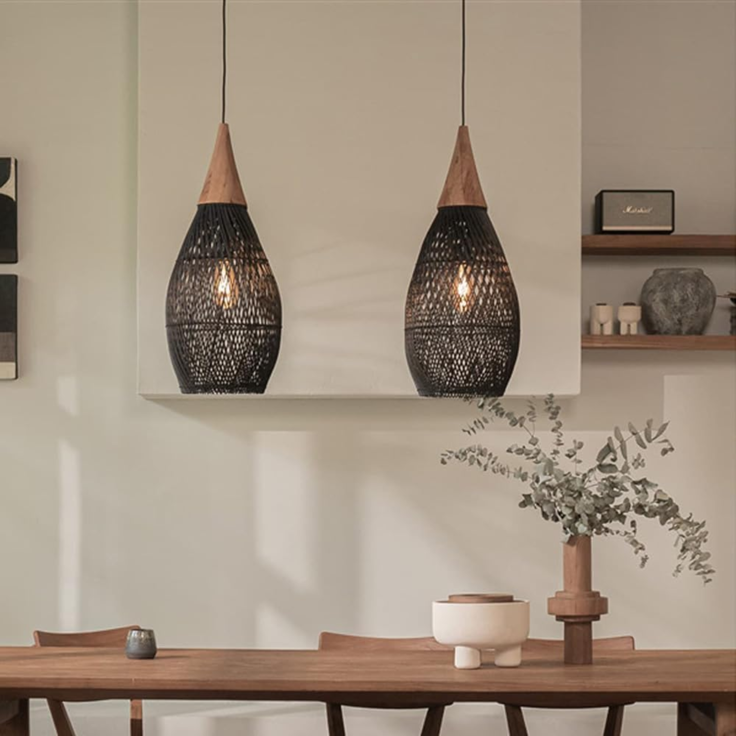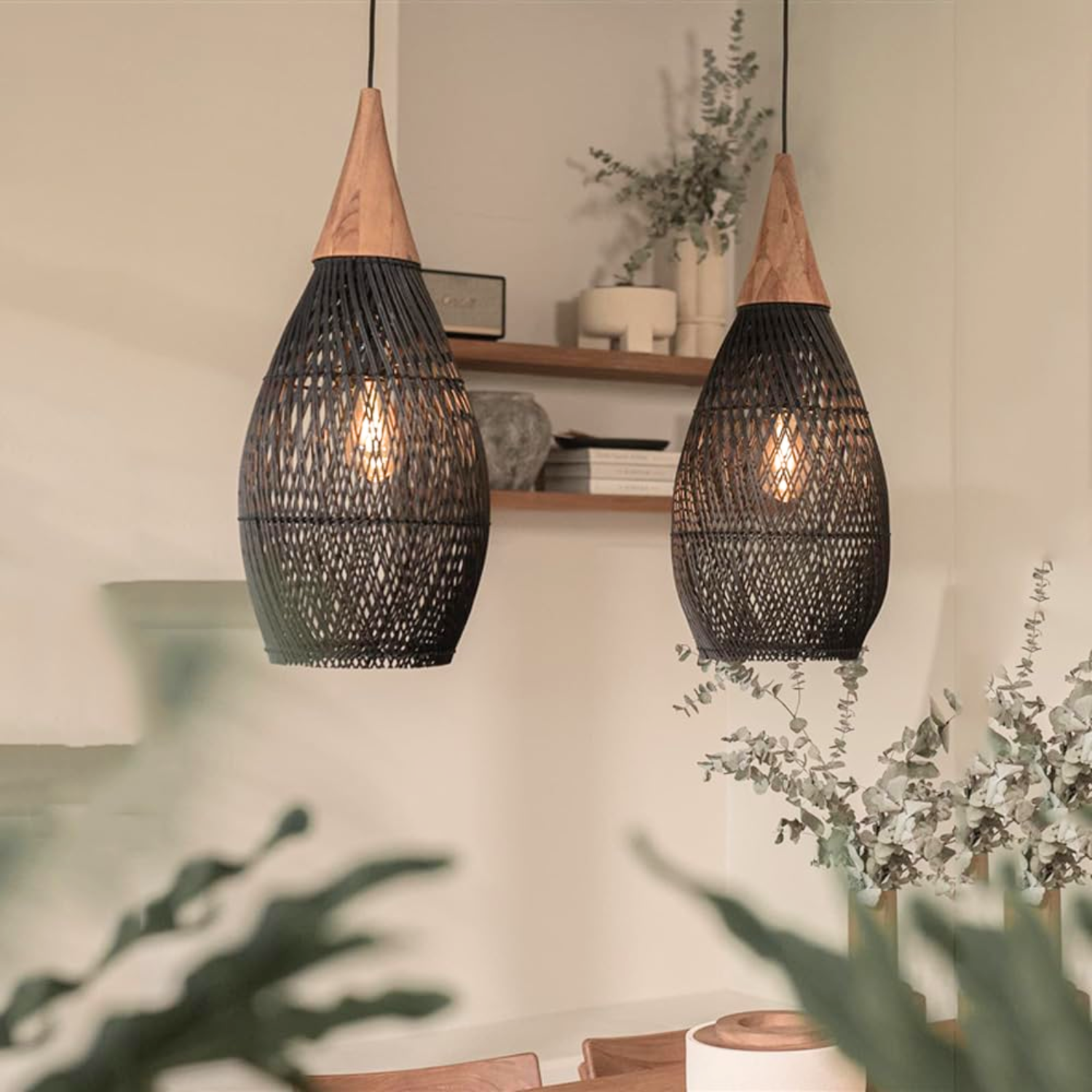 La Lámpara Colgante de Ratán Negro Gota de 25 cm es una pieza única de iluminación decorativa que fusiona lo artesanal con lo contemporáneo. Su pantalla tejida a mano en fibras naturales y base de madera crea un diseño cálido y atemporal, ideal para ambientes de estilo boho, wabi-sabi y decoraciones de inspiración natural.