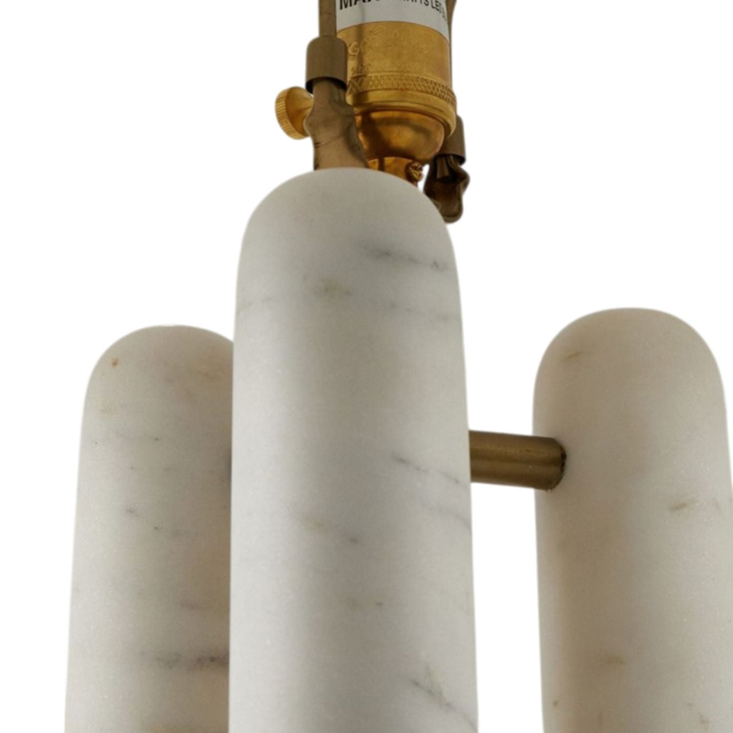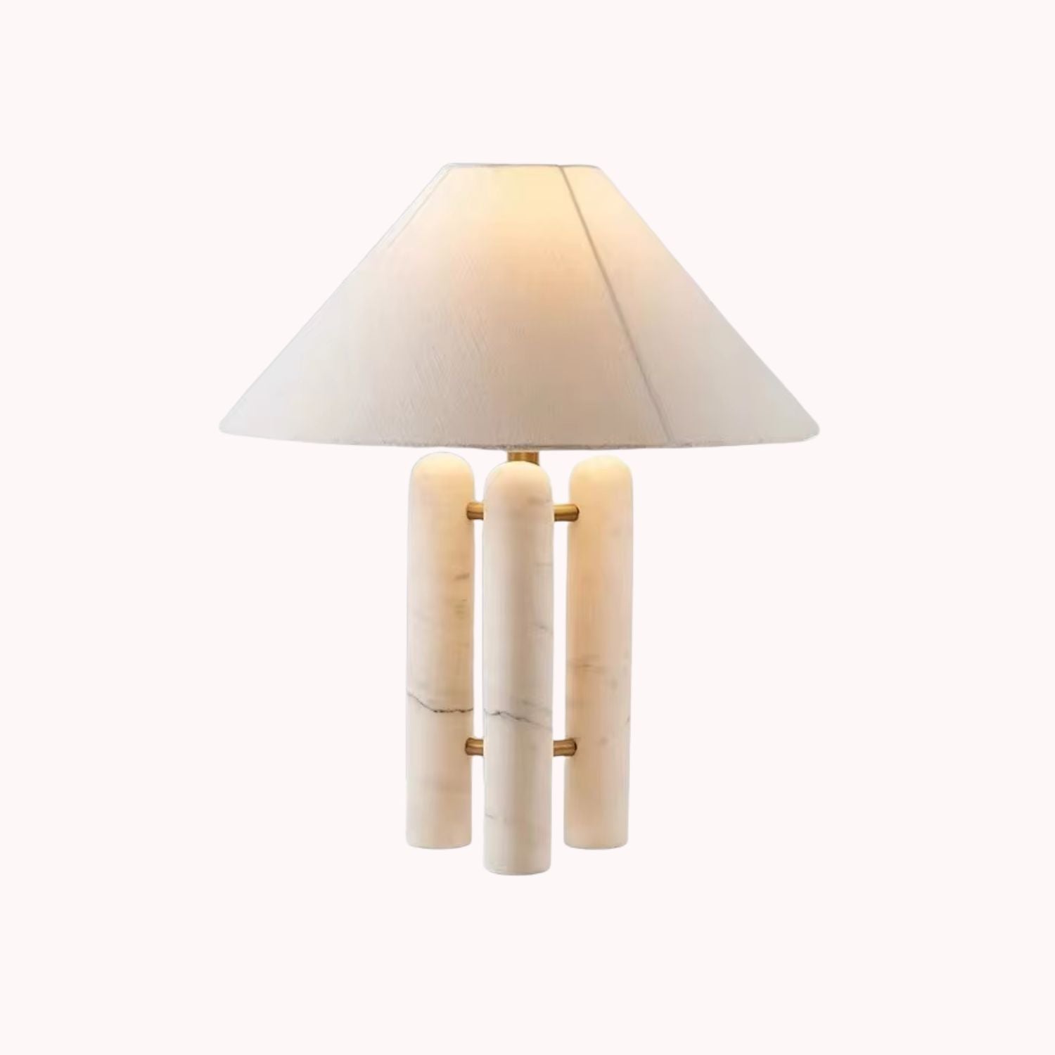 Descubre esta lámpara de mesa con base en mármol natural, diseñada para transformar cualquier ambiente con elegancia y estilo atemporal. Con tres columnas cilíndricas de mármol crema y vetas sutiles que acarician la textura, aporta un toque escultórico y exclusivo a tu sala, dormitorio u oficina.