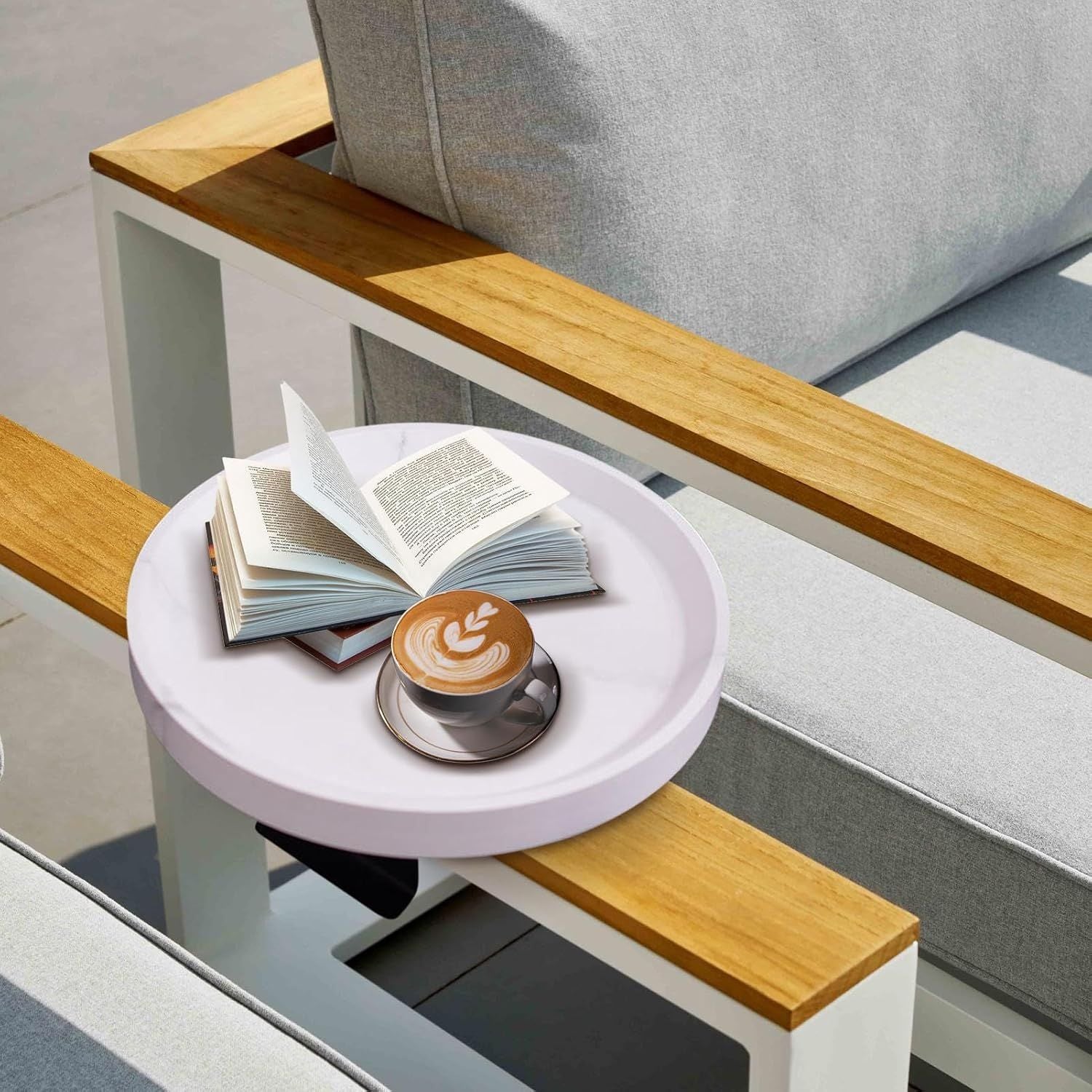 Imagina cerca de ti un rico café mientras descansas. Mesa Brazo de Sofá Estilo Blanco Mármol, la cual te proporciona estabilidad, ya que tiene una base posicional adaptable al descansa brazos de tu sofá. Se reajusta con un sistema sencillo de enroscamiento a presión el cual se encuentra en la parte inferior de la mesa, su base es de metal dando mayor soporte al peso. Otra característica es su superficie, tiene un borde anticaídas de 3cm; su diseño es moderno, estilo mármol.