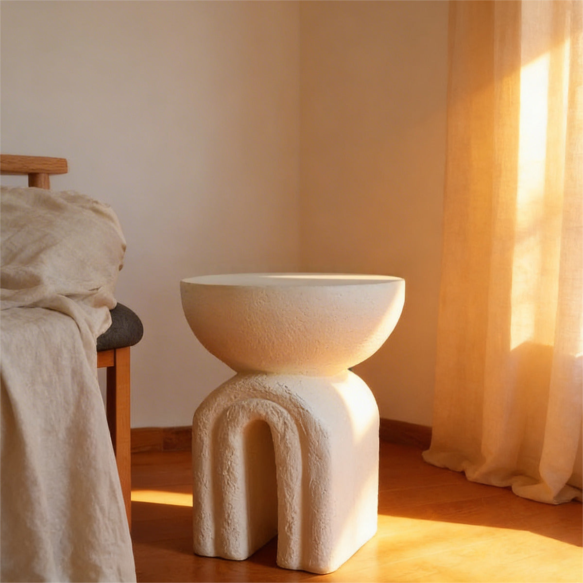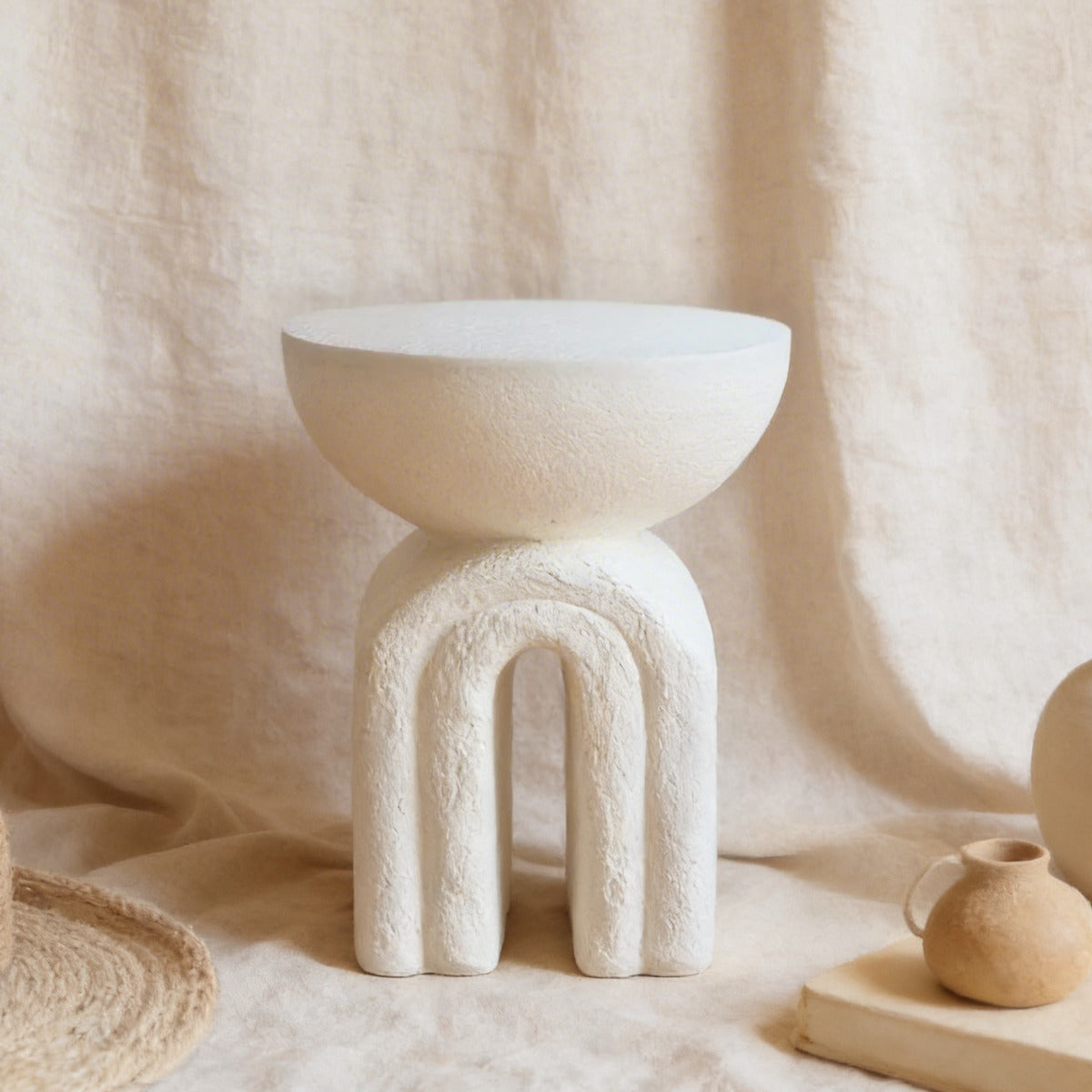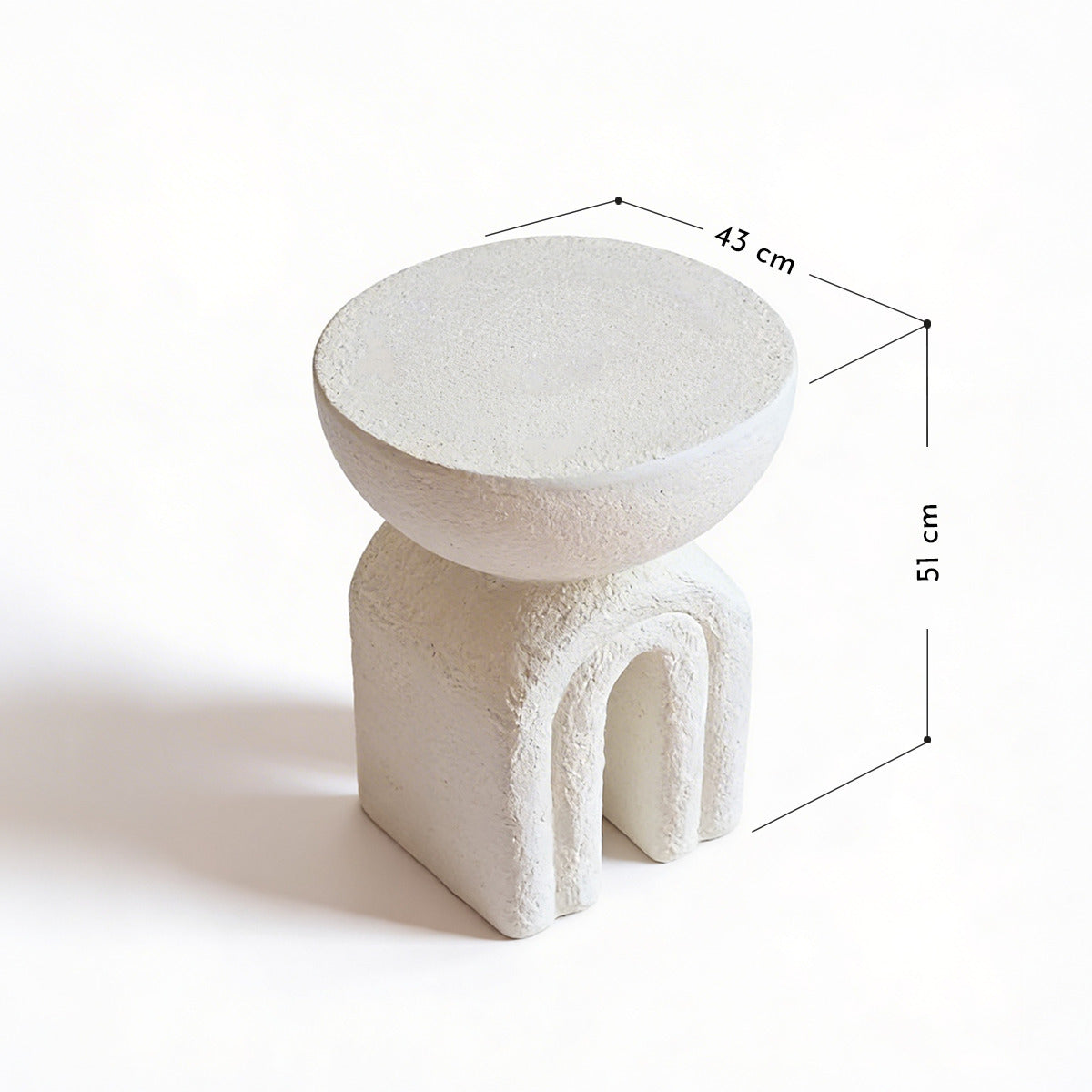 Perfecta para ser utilizada como mesa de apoyo junto al sofá o como un velador escultórico en el dormitorio, su diseño compacto se adapta magistralmente a rincones de lectura o espacios de relajación. Al ser una pieza con carácter artesanal, cada ángulo ofrece una perspectiva distinta, convirtiéndola en un objeto de arte funcional que aporta profundidad y calidez sensorial a tu hogar.