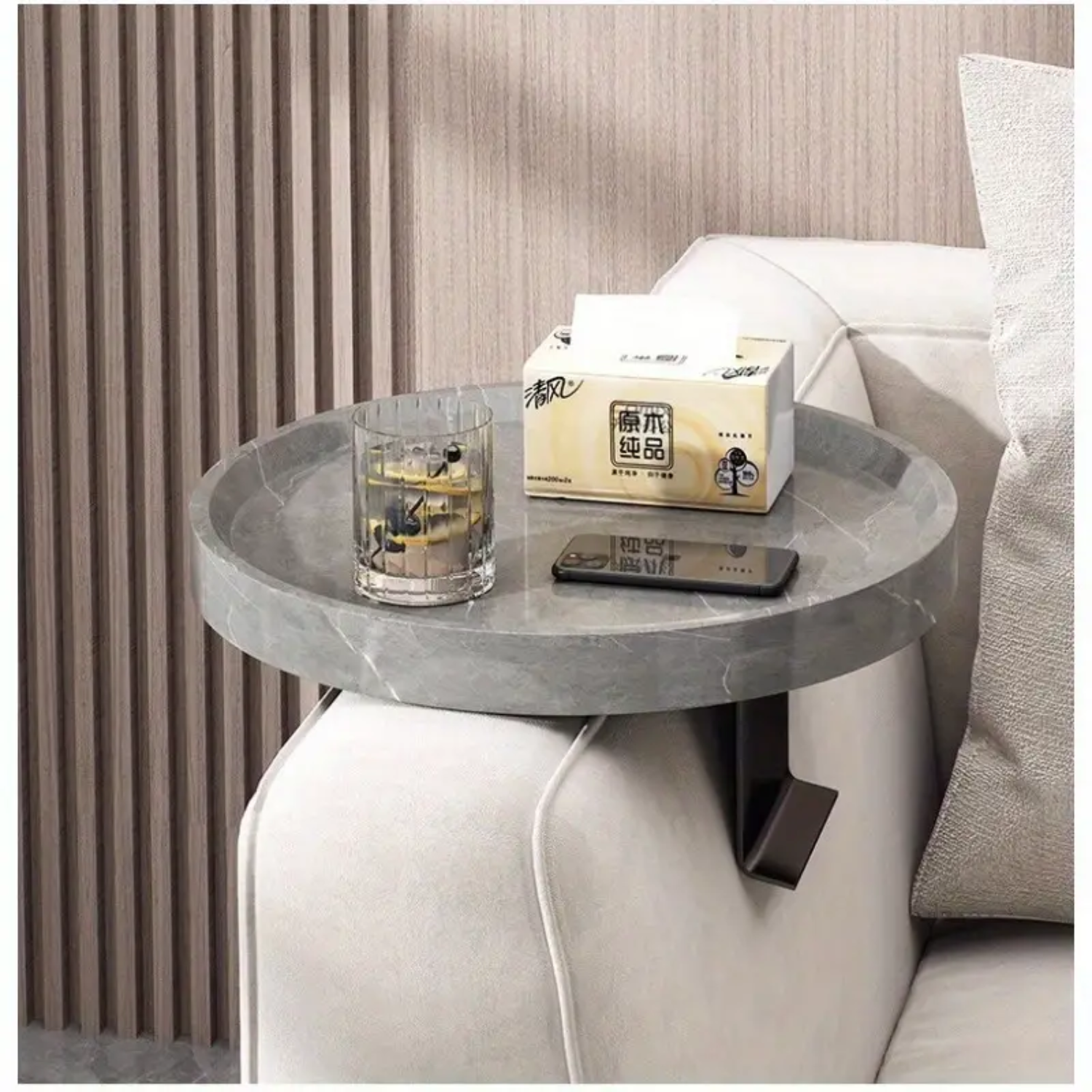 Imagina cerca de ti un rico café mientras descansas. Mesa Para Sofá Gris Redonda te proporciona estabilidad, ya que tiene una base posicional adaptable al descansa brazos de tu sofá. Se reajusta con un sistema sencillo de enroscamiento a presión el cual se encuentra en la parte inferior de la mesa, su base es de metal dando mayor soporte al peso. Otra característica es su superficie, tiene un borde anticaídas de 3cm; su diseño es moderno, estilo mármol.