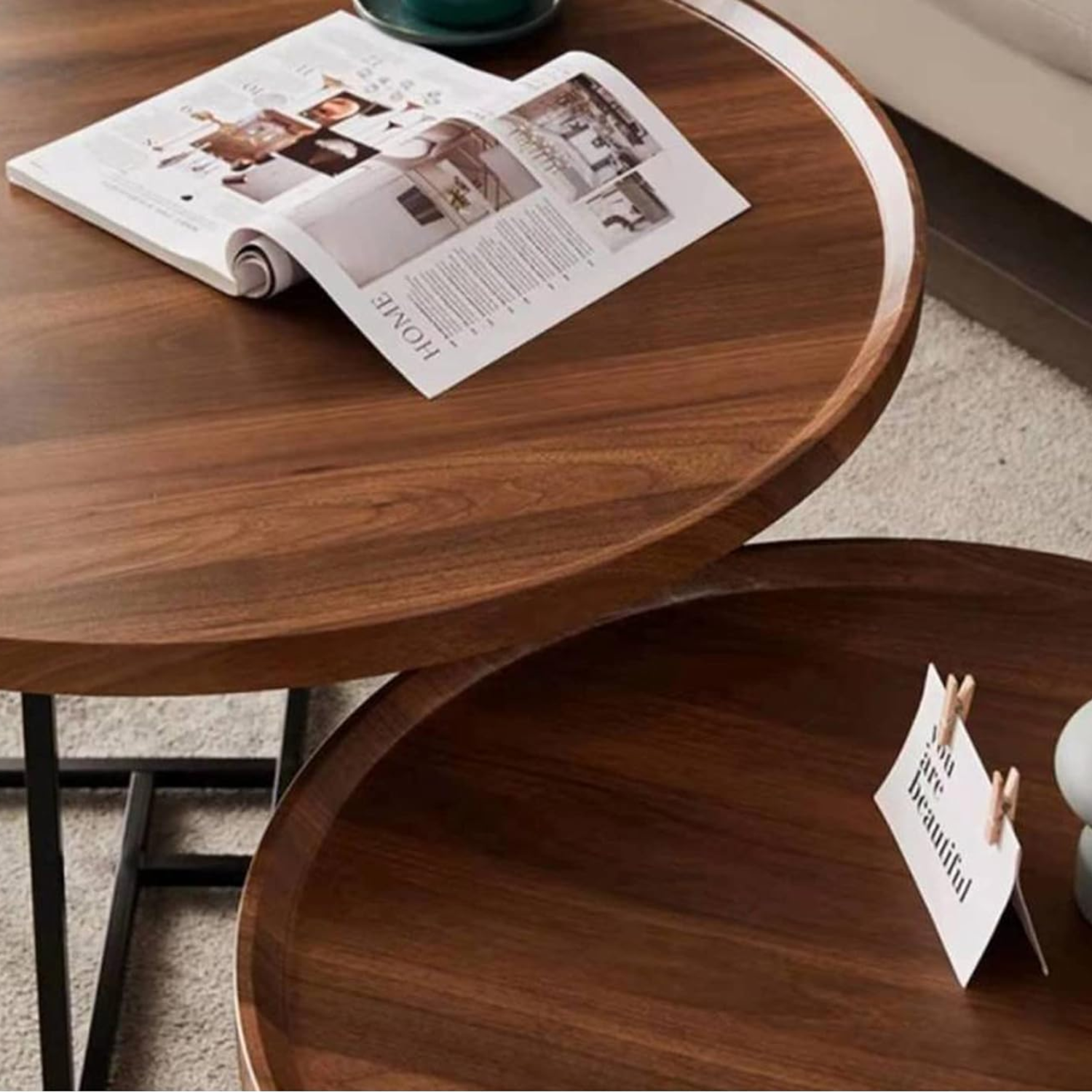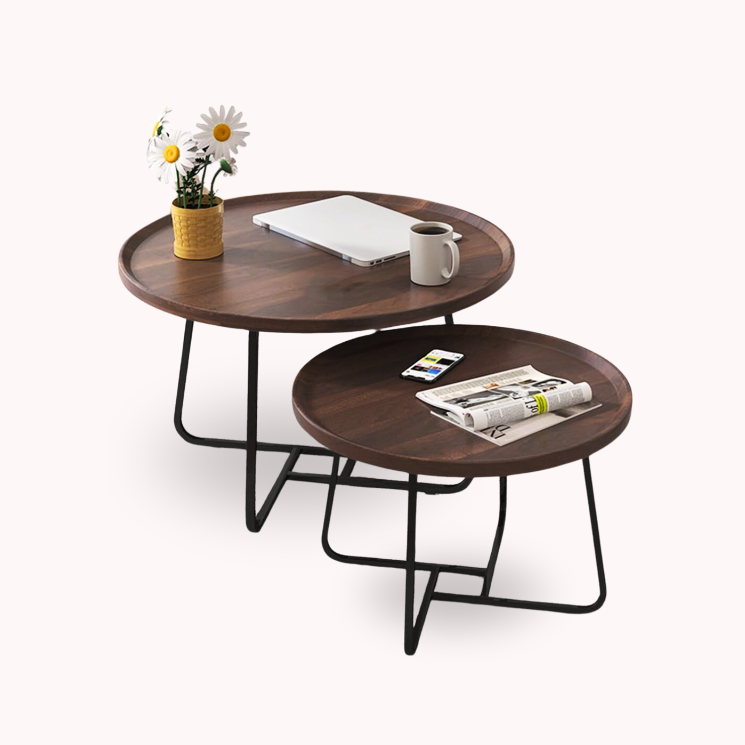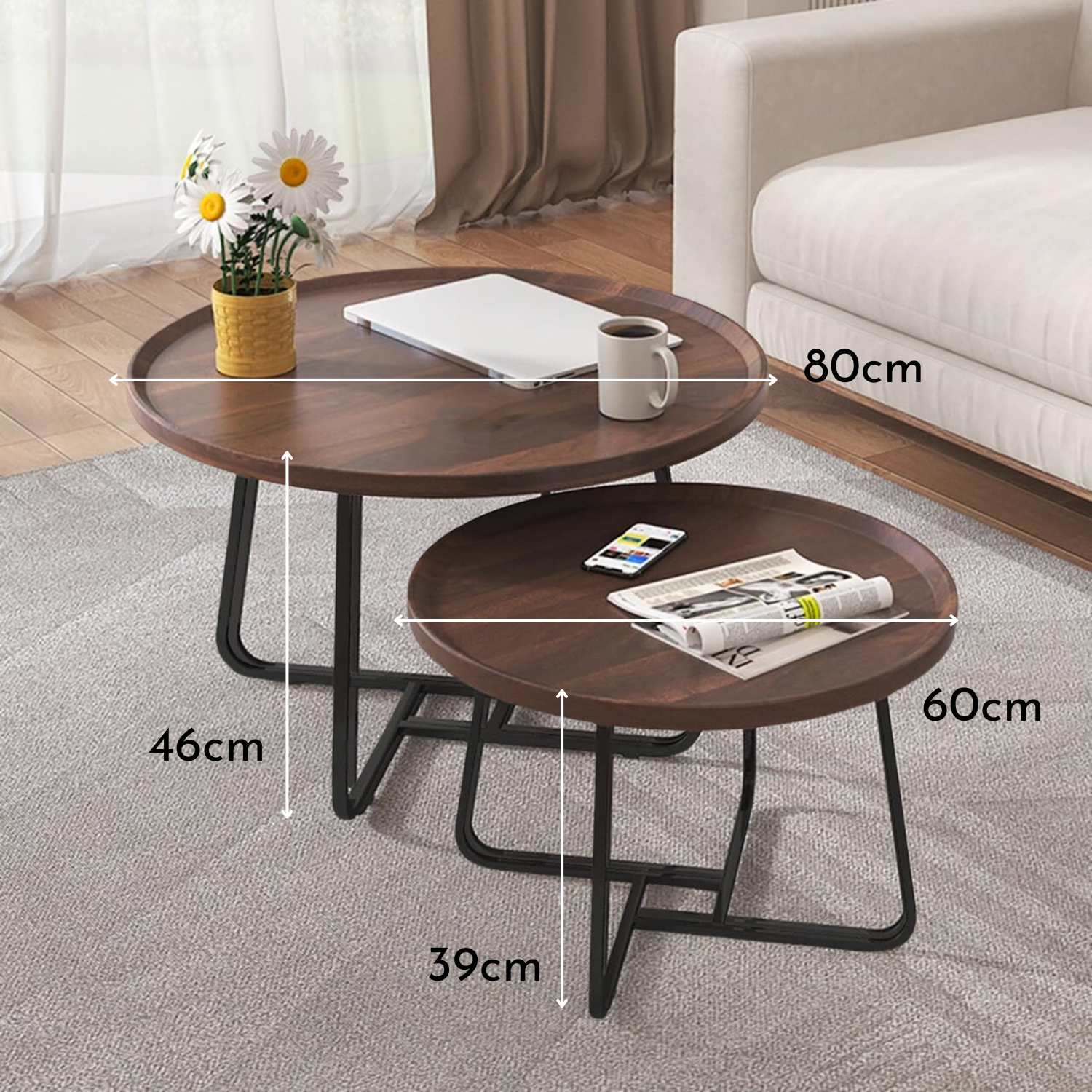 Añade elegancia a tu ambiente con este juego de Mesas Nido de Centro en madera. Firme estructura de soporte en tubo cuadrado de metal, el cual se encuentra equilibrado uniendo cada una de sus patas. Superficies redondas con fino acabado, borde anticaida en todo su contorno. Permite dar uso de manera independiente o bien, haciendo un conjunto con ambas mesas dando esa decoración que tu ambiente necesita.