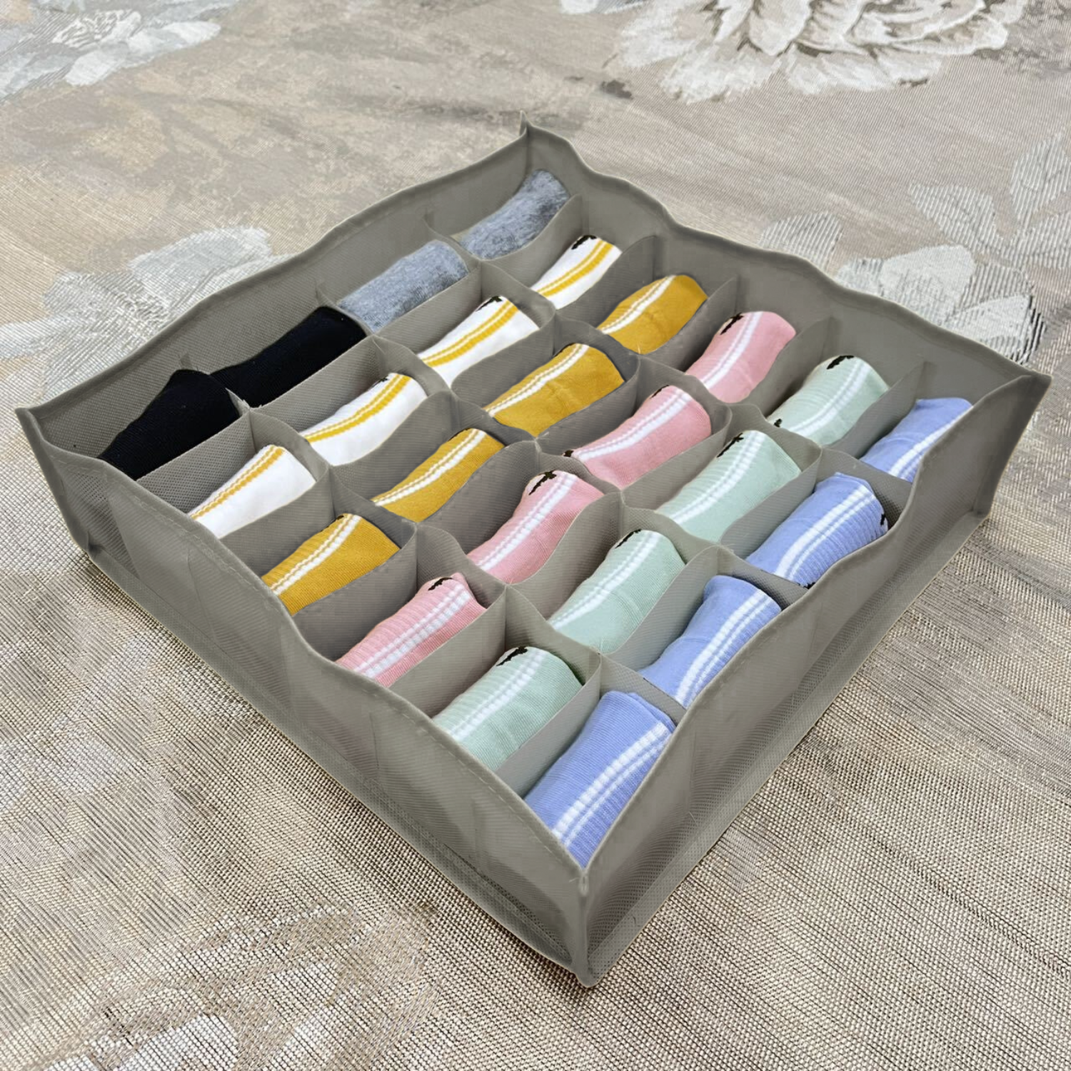 Organiza tu ropa Interior con este Económico Organizador de Calcetines de Tela. Su diseño completamente Plegable lo vuelve ligero y fácil de adaptar a diferentes espacios de tu Closet, en cajoneras o repisas. Cuenta con divisiones para dar espacio a 24 compartimientos de guardado para calcetines. Es fácil de usar, no requiere instalación. El diseño se verá erguido una vez que los calcetines sean presentados en su interior.