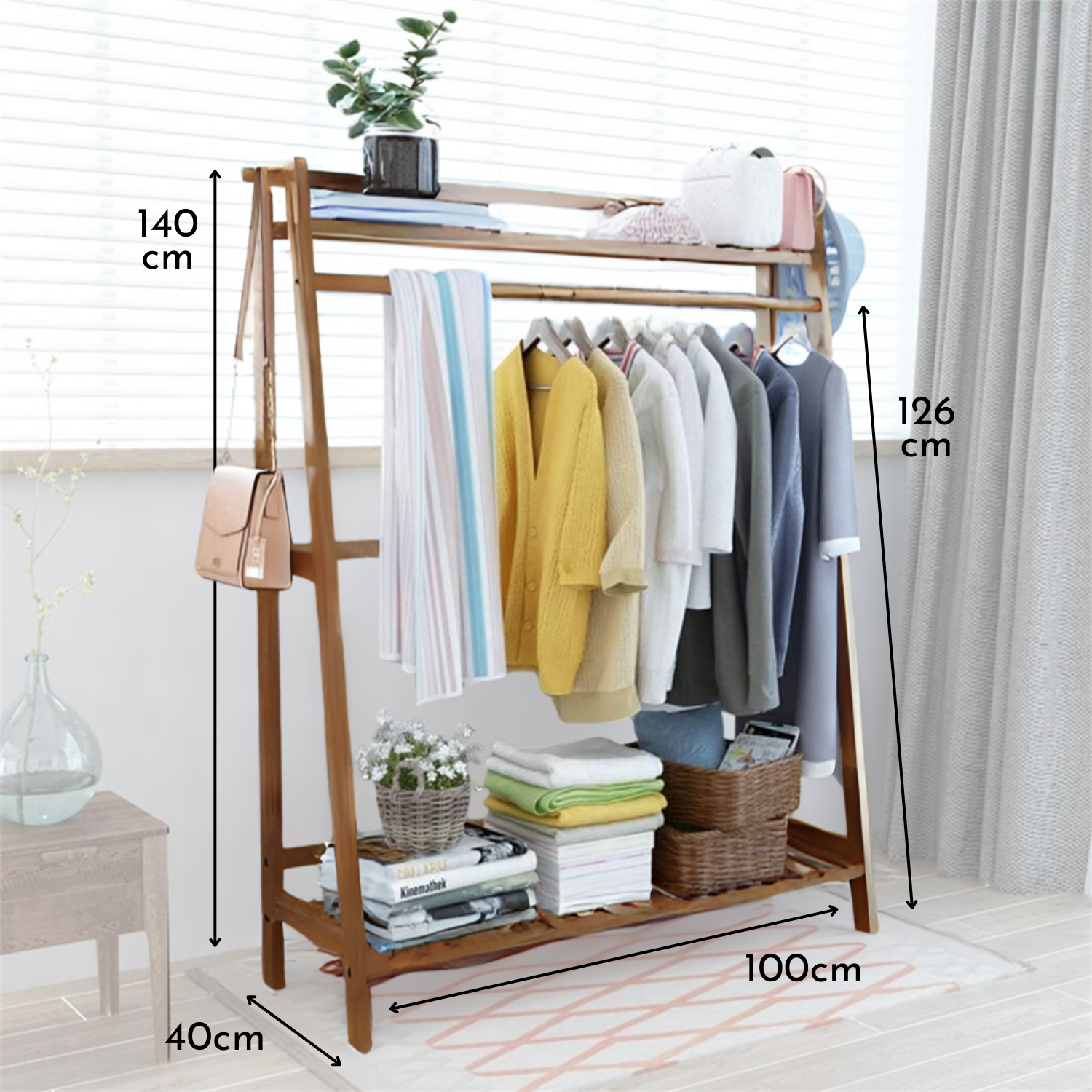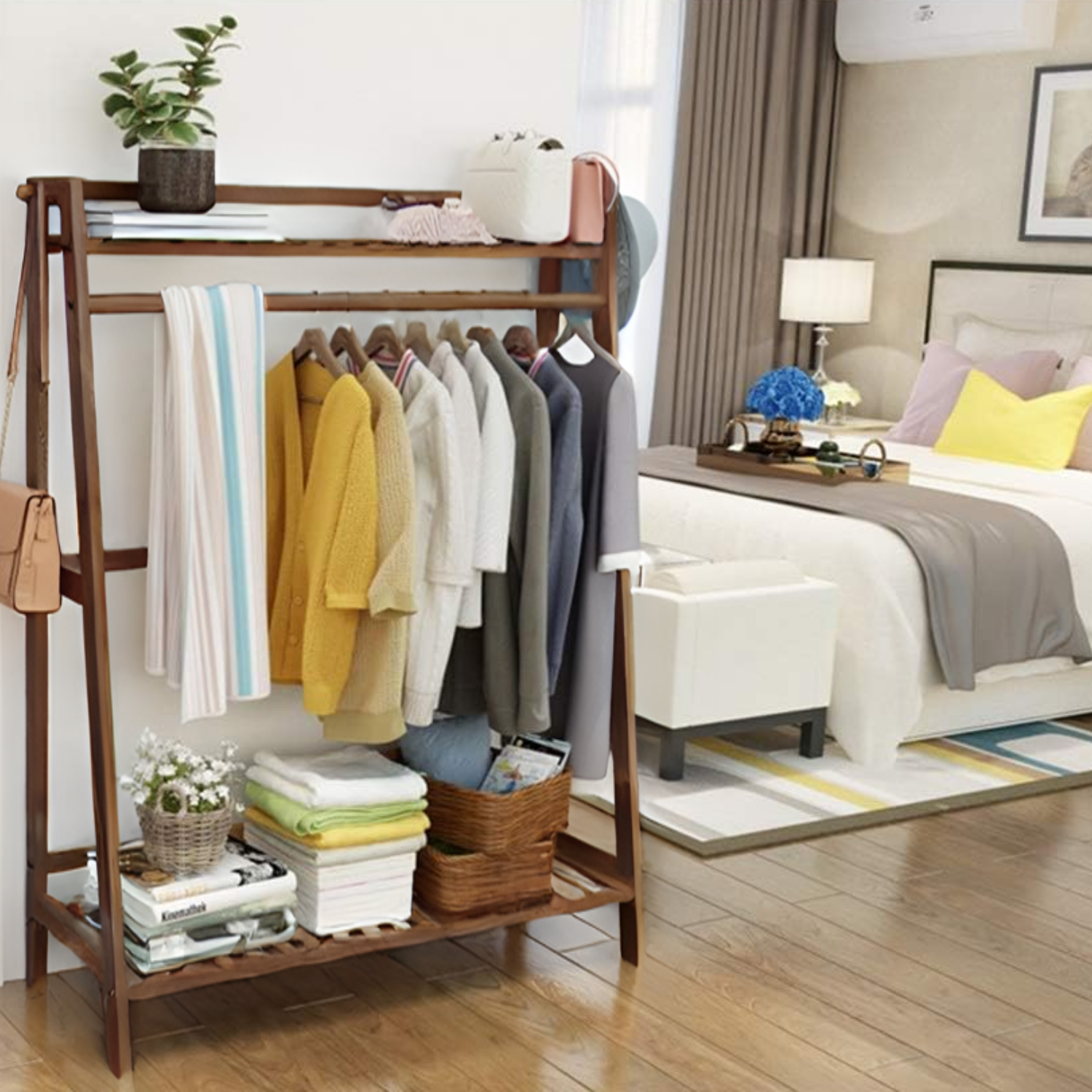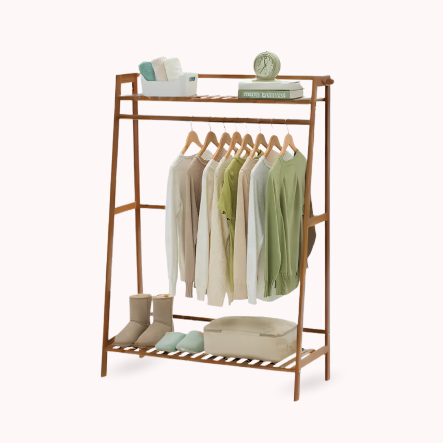 Este práctico organizador vertical cuenta con una barra central resistente para colgar prendas, repisas superior e inferior para zapatos, cajas o decoración, y colgadores laterales tipo percha perfectos para bolsos, sombreros, bufandas o accesorios.