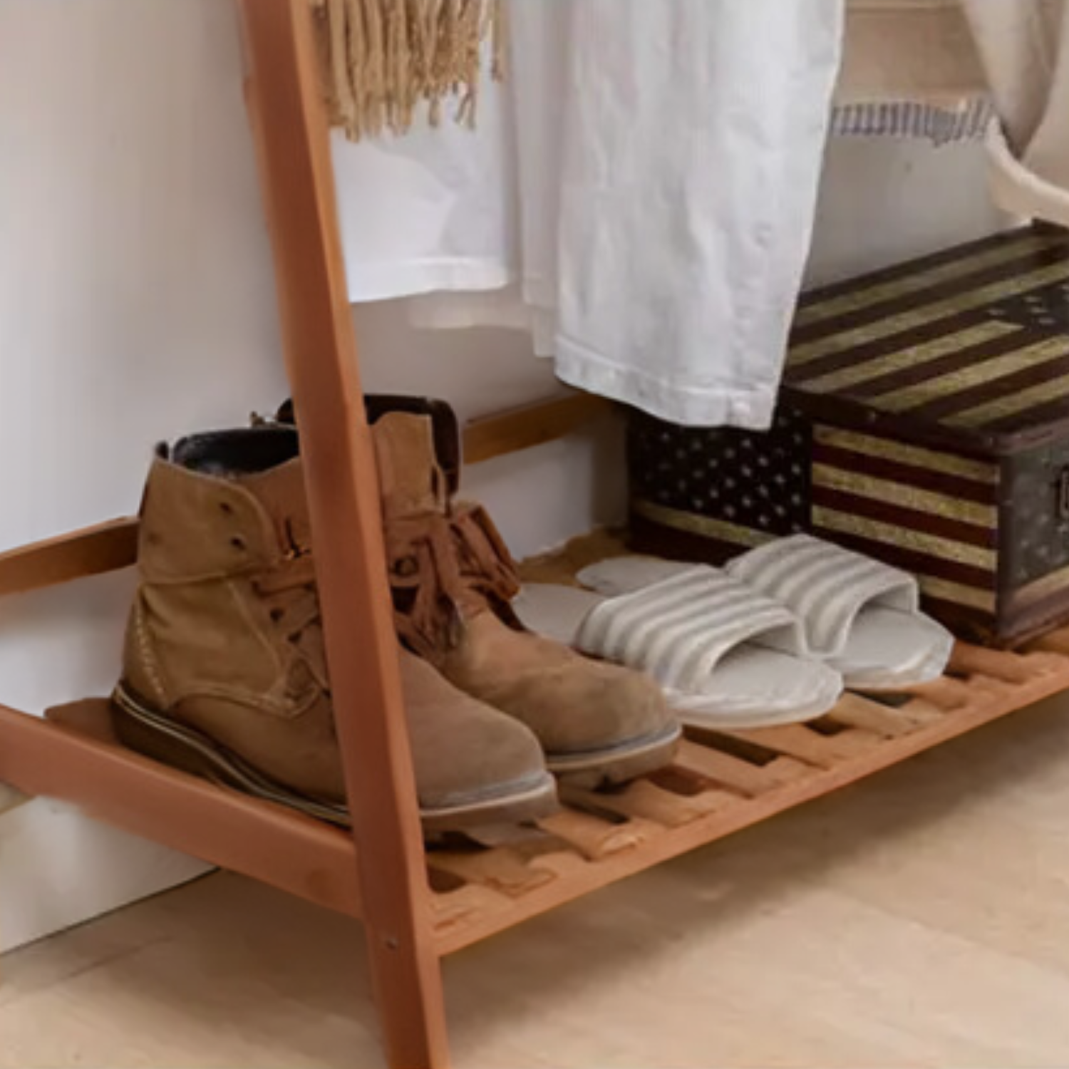 Este perchero con zapatera es la solución perfecta para quienes buscan ordenar sin perder estilo. Convierte tu espacio en un ambiente funcional y bien organizado.