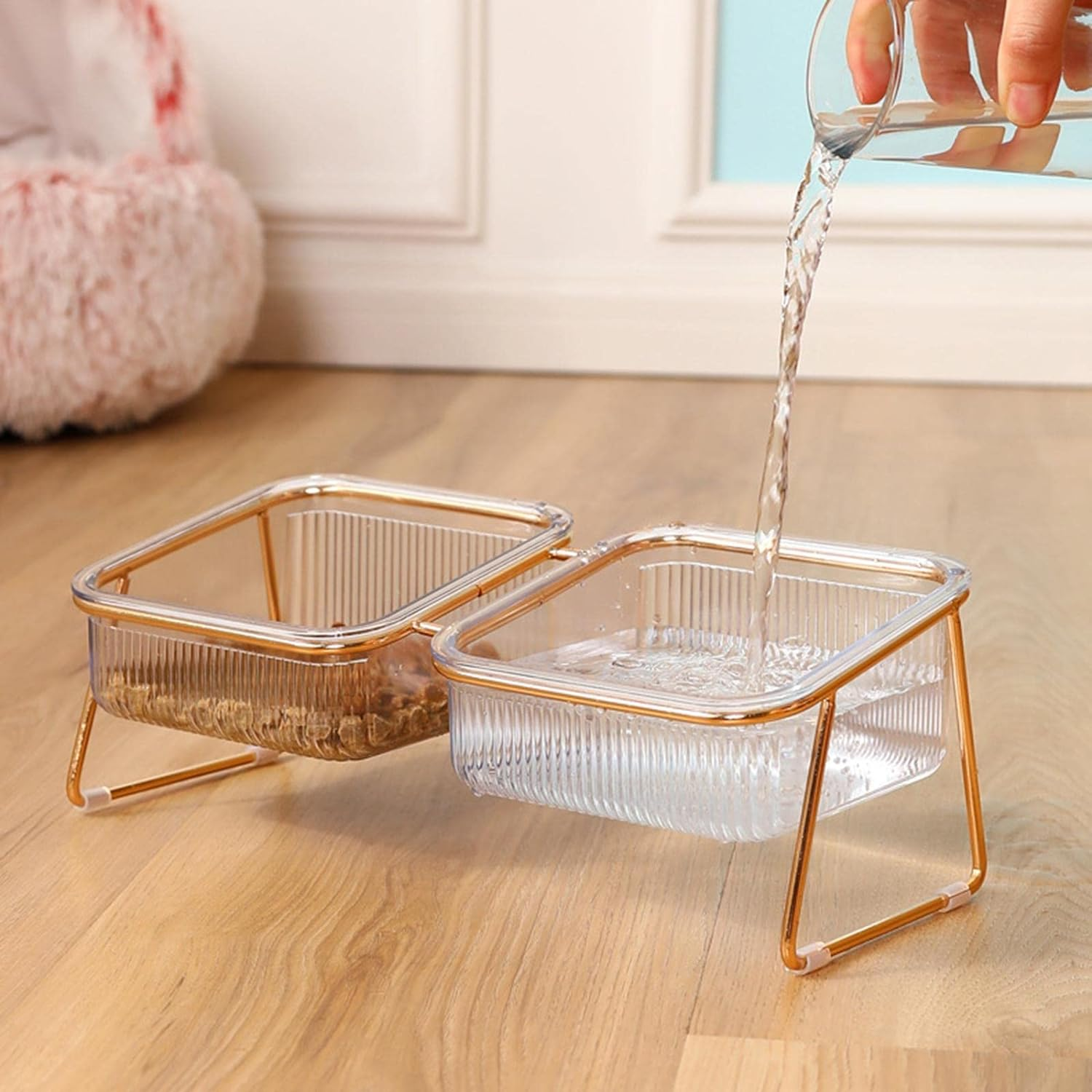 Materiales resistentes y elegantes: Cuencos de plástico transparente de alta durabilidad combinados con una estructura metálica sólida que aporta estilo y estabilidad.