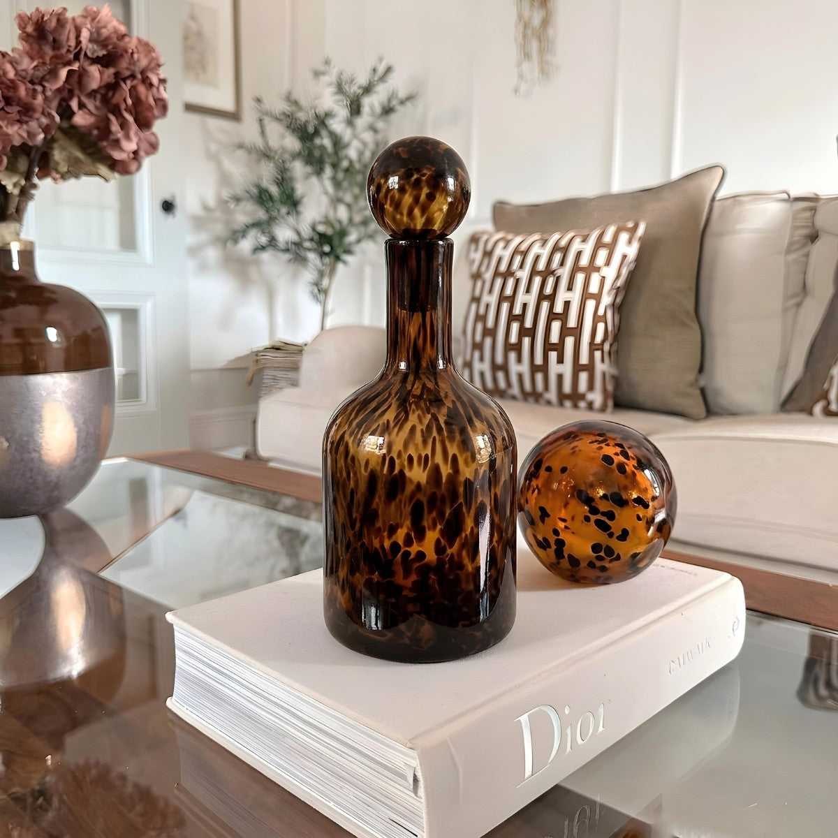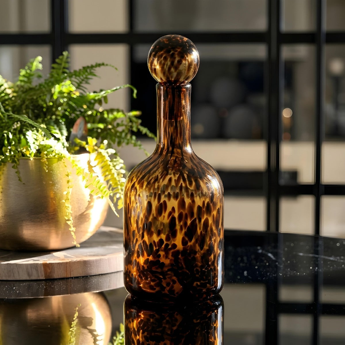 Añade una dosis de audacia y elegancia a tu hogar con nuestra botella decorativa de vidrio. Esta pieza destaca por su sofisticado acabado que recuerda al animal print en tonos mocha y ámbar, creando un juego de luces y sombras único gracias a su patrón moteado. Su silueta estilizada la convierte en una escultura de vidrio ideal para destacar en mesas de arrimo, buffets o como pieza central en mesas de comedor.
