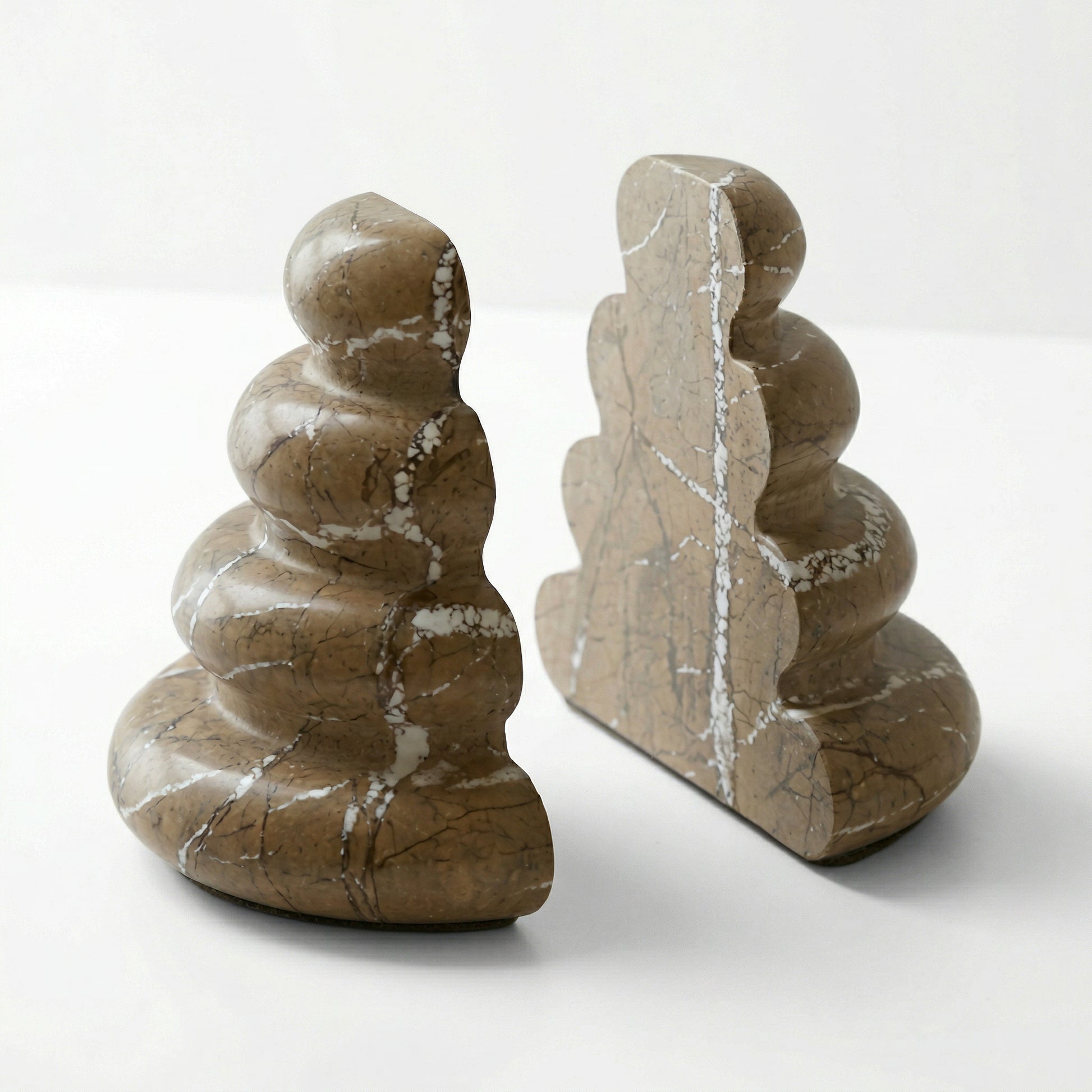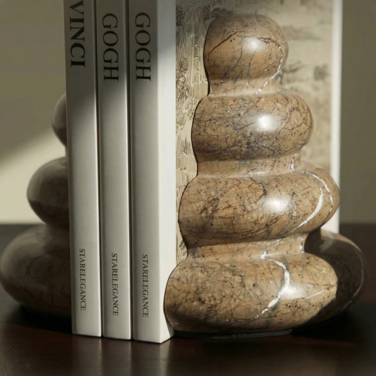Gracias a su fabricación en mármol auténtico, cada par presenta vetas únicas e irrepetibles, lo que lo convierte en un objeto decorativo exclusivo. Su estructura sólida y pesada garantiza que incluso los libros volúmenes más grandes permanezcan en su lugar, adaptándose perfectamente a estilos decorativos modernos o contemporáneos.
