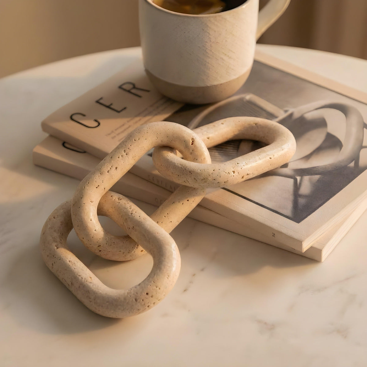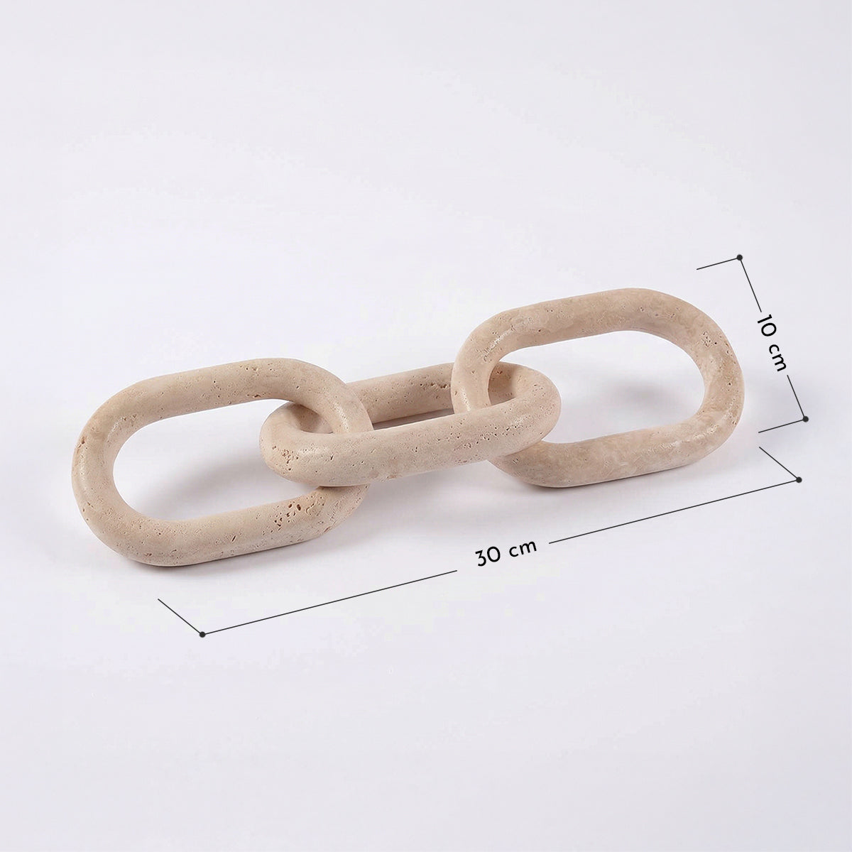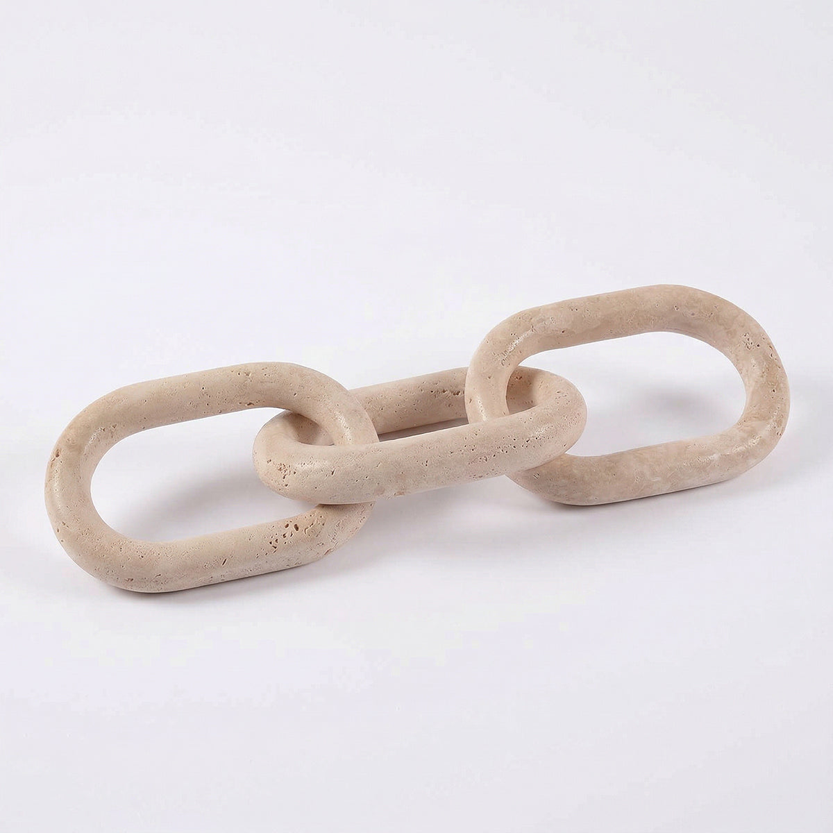Añade una textura orgánica y arquitectónica a tus espacios con nuestra Cadena de eslabones decorativos de travertino. Esta pieza artesanal, tallada en piedra natural, es el complemento ideal para quienes buscan un estilo Wabi sabi o mediterráneo moderno. Gracias a su porosidad característica y su tono crema neutro, queda perfecto para acentuar pequeñas mesas de centro, bandejas o arrimos.