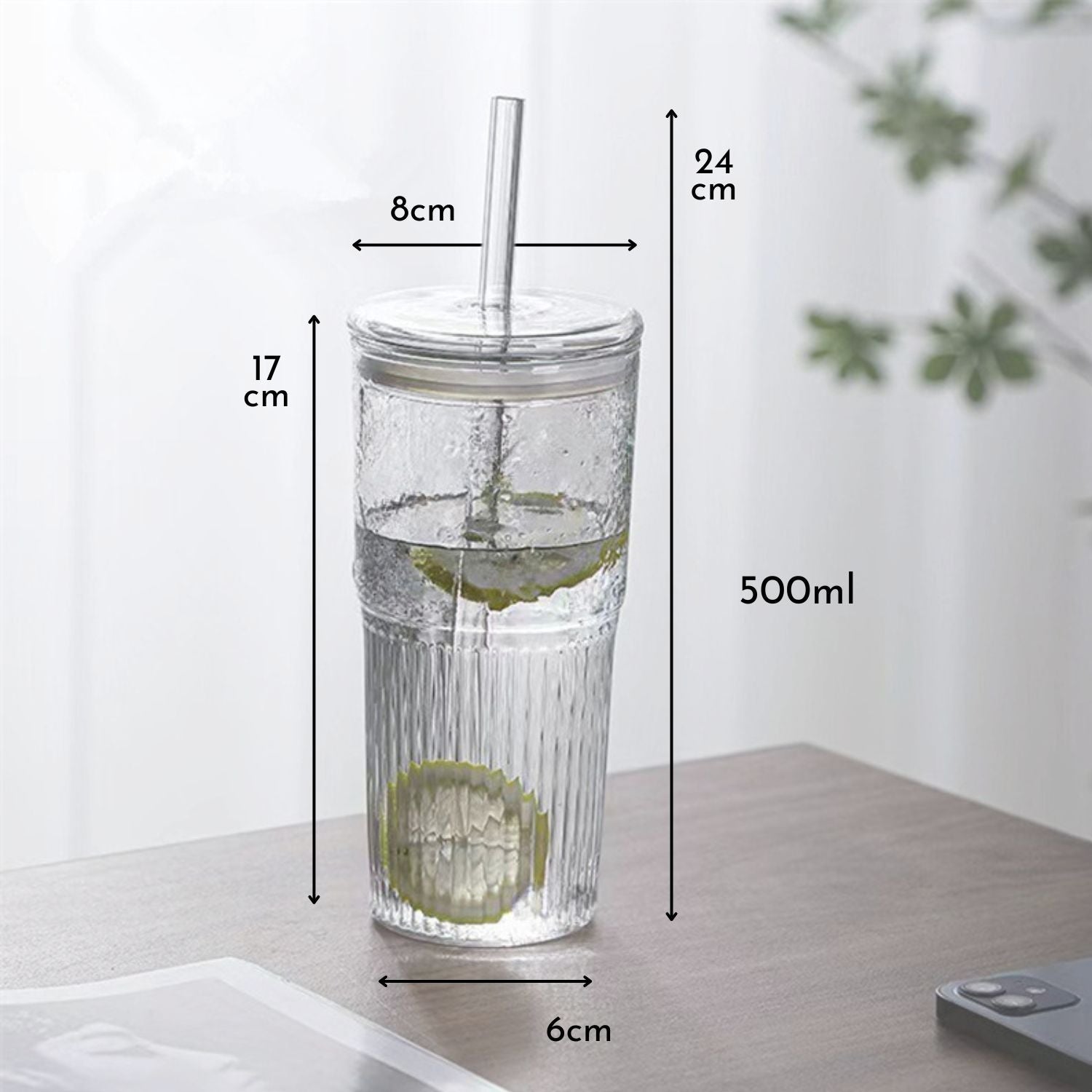 Conviértelo en tu preferido: nuestro Vaso de Vidrio con Bombilla y Tapa Perlado de 500 ml, diseñado sin asa, es perfecto para café, jugos, leche moca, cerveza y más. Ideal para desayunos, celebraciones, aniversarios y cumpleaños, este vaso combina un estilo moderno con funcionalidad práctica.Diseño Elegante y Duradero, con un acabado de rayas verticales que aporta una sensación sofisticada y atractiva. Su interior brillante ofrece un toque refinado. Fabricado con vidrio resistente, soporta golpes térmicos, arañazos y roturas, garantizando larga vida útil y confianza.