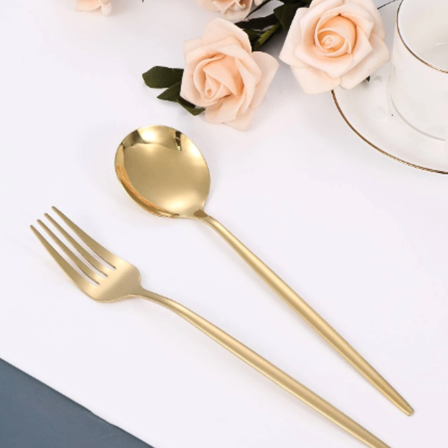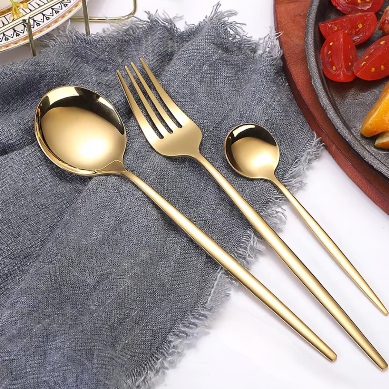 Un toque de elegancia hasta en los más mínimos detalles siempre harán la diferencia con este Set de 36 Cubiertos de Acero Inoxidable. Incluye 12 Cucharas, 12 tenedores y 12 cucharitas para postre. Su diseño de líneas finas y delgados, más el toque dorado darán frescura a la presentación de tu mesa, al recibir invitados. Pensado para preparaciones y posturas de mesa de bocados que no requieran cuchillería. Su empaque de presentación lo vuelven también, una idea perfecta para obsequio. Fabricados en acero de grado comestible, son aptos para el uso cotidiano. Fáciles de usar y limpiar.