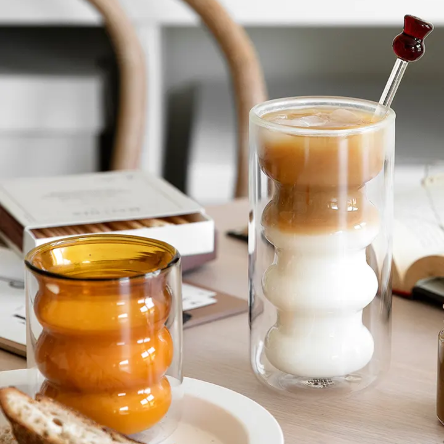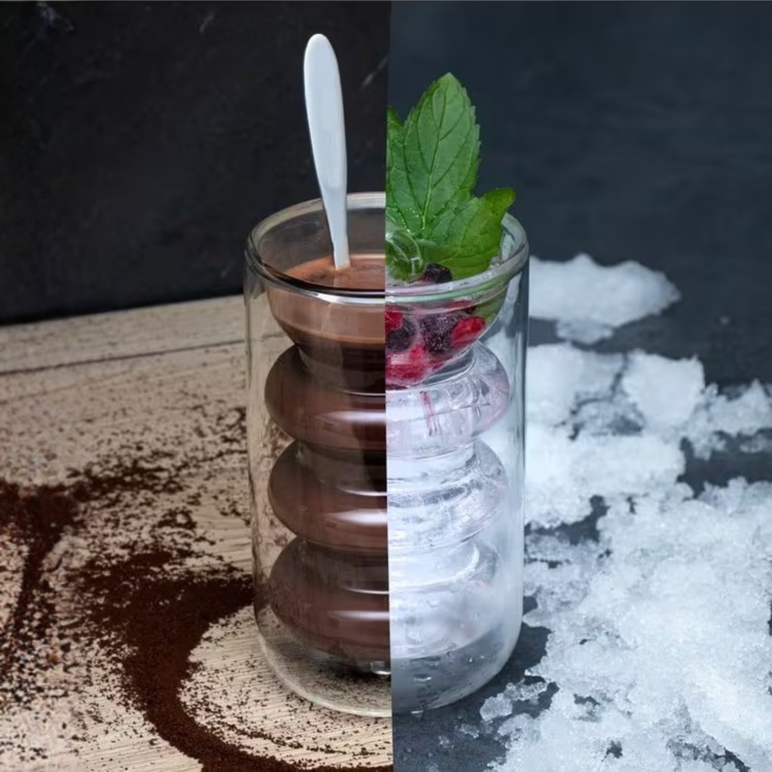Su innovadora estructura de doble vidrio crea un atractivo efecto visual flotante, destacando el contenido y aportando sofisticación a tu mesa. Además de su estética única, el doble fondo cumple una función práctica: reduce la condensación externa y protege tus manos del calor, brindando una experiencia cómoda y segura en cada uso.