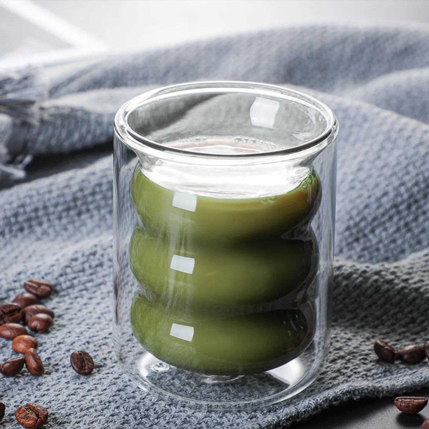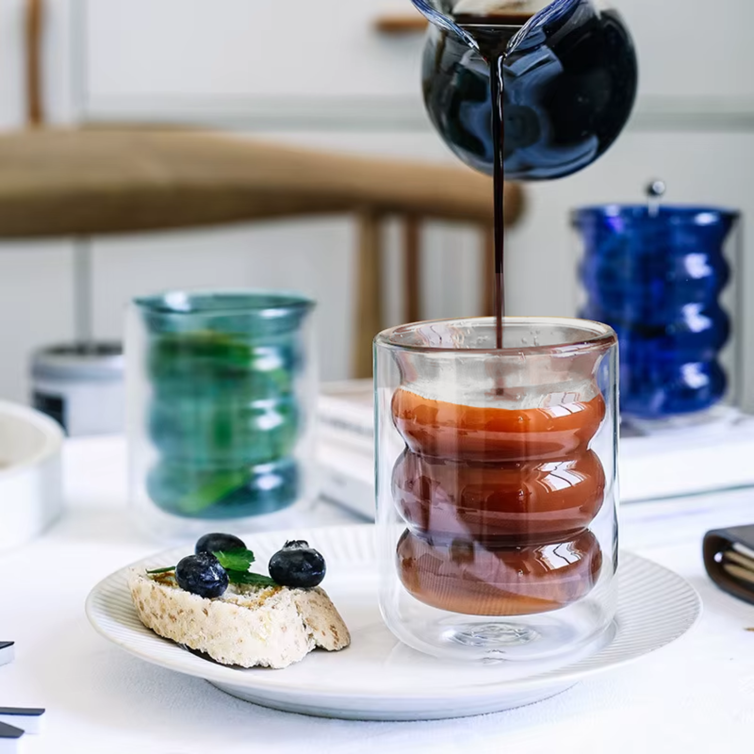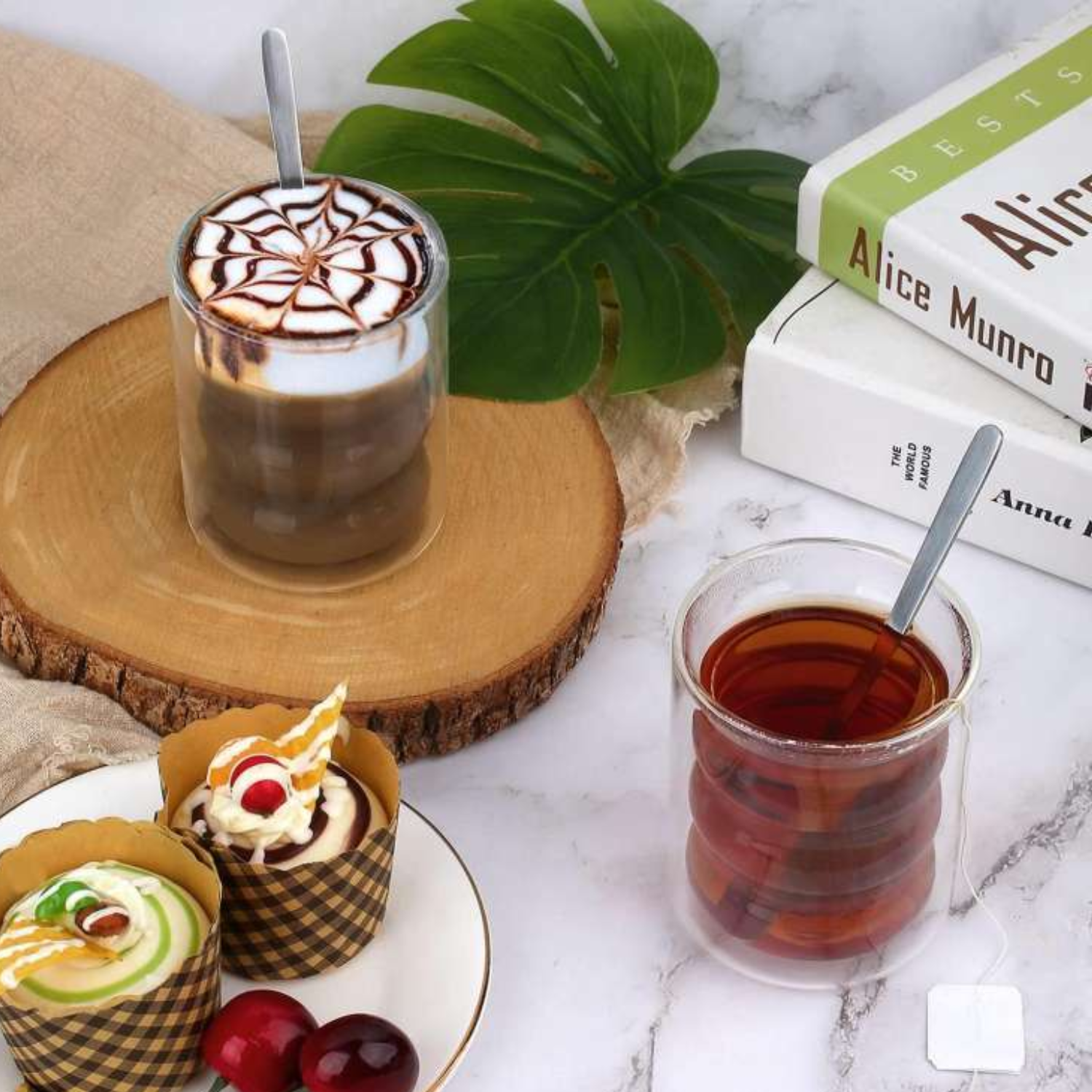 Aporta estilo y sofisticación a la decoración de tu hogar con el Set de 4 Vasos de Vidrio Doble Fondo Ondas Bajos, una opción elegante y funcional para disfrutar tus bebidas favoritas. Elaborados en vidrio borosilicato de alta resistencia, estos vasos son aptos para bebidas frías y calientes, ideales para café, té, infusiones, jugos o tragos especiales.