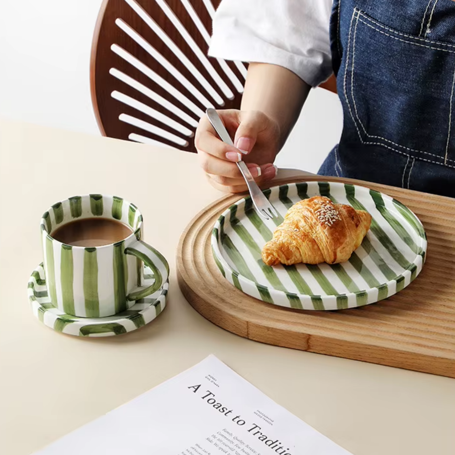 Da un toque cálido y creativo a tu cocina con este hermoso Set de Platos y Tazas Rayas Vintage Verde. ¡Hazlo tuyo y transforma tus momentos en la mesa!