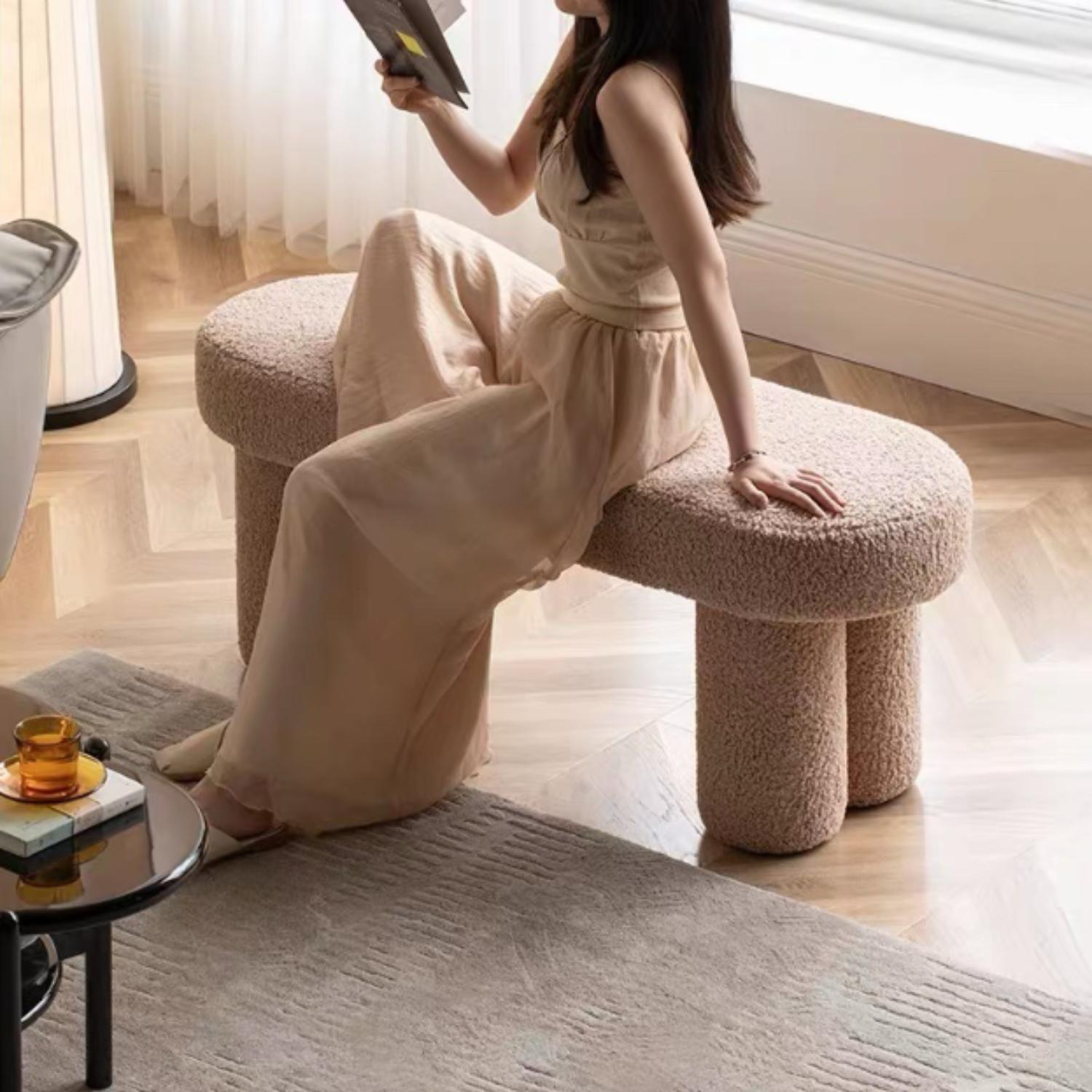 Su diseño minimalista de líneas curvas crea un estilo armonioso que complementa fácilmente cualquier decoración contemporánea. El tapizado en sherpa tipo pelo de cordero no solo aporta suavidad y calidez, sino que también lo convierte en un mueble totalmente en tendencia. El tono mocha crème, dentro de la gama de los cafés, añade elegancia y una sensación acogedora a cualquier ambiente.
